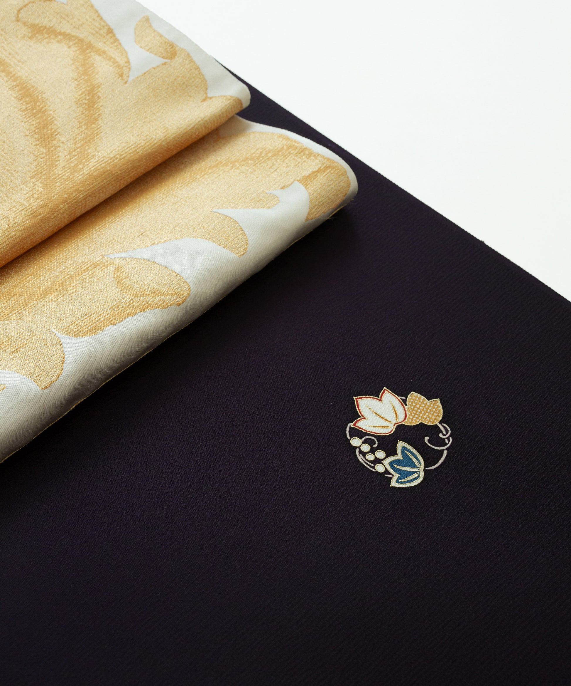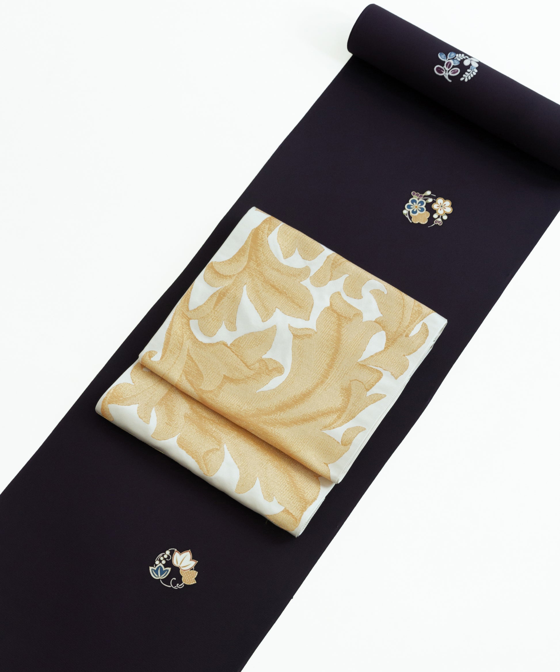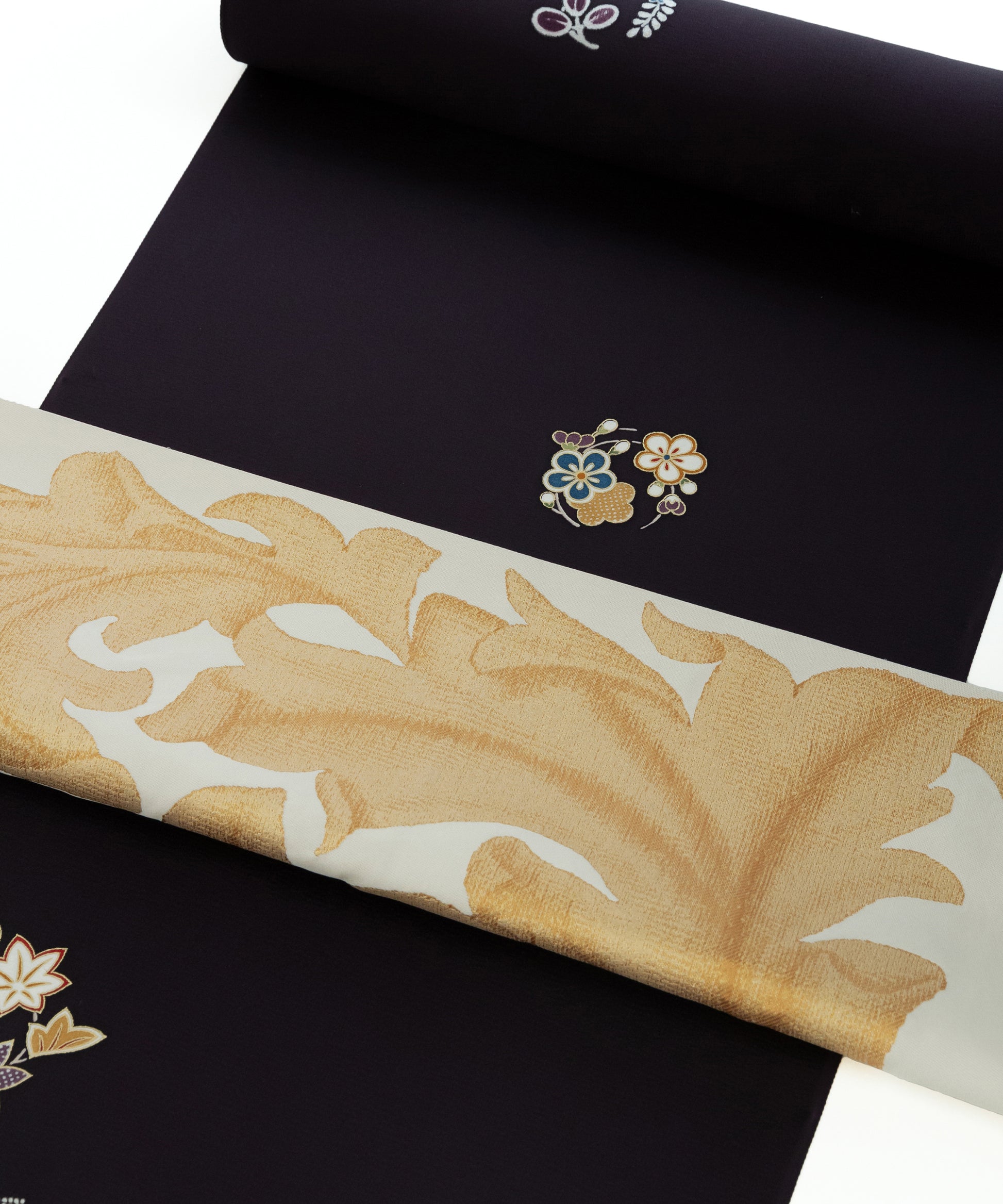 〇コーディネートの帯は、紫紘謹製袋帯「アカンサス」でございます。大変しなやかな織上がりの帯地に、特徴である深い切れこみのある葉が大胆に表現されております。準礼装としても、無地感の織物に合わせて洒落帯としての装いにも存在感ある組み合わせができる帯でございます。こちらもぜひお気軽にお問い合わせくださいませ。