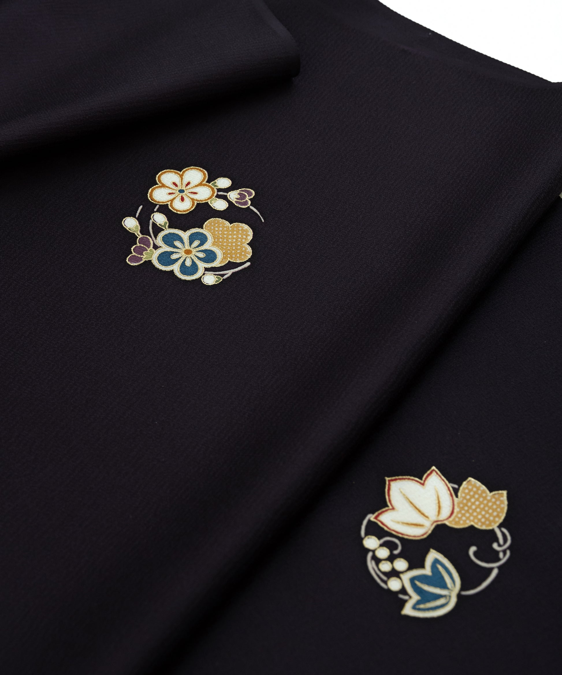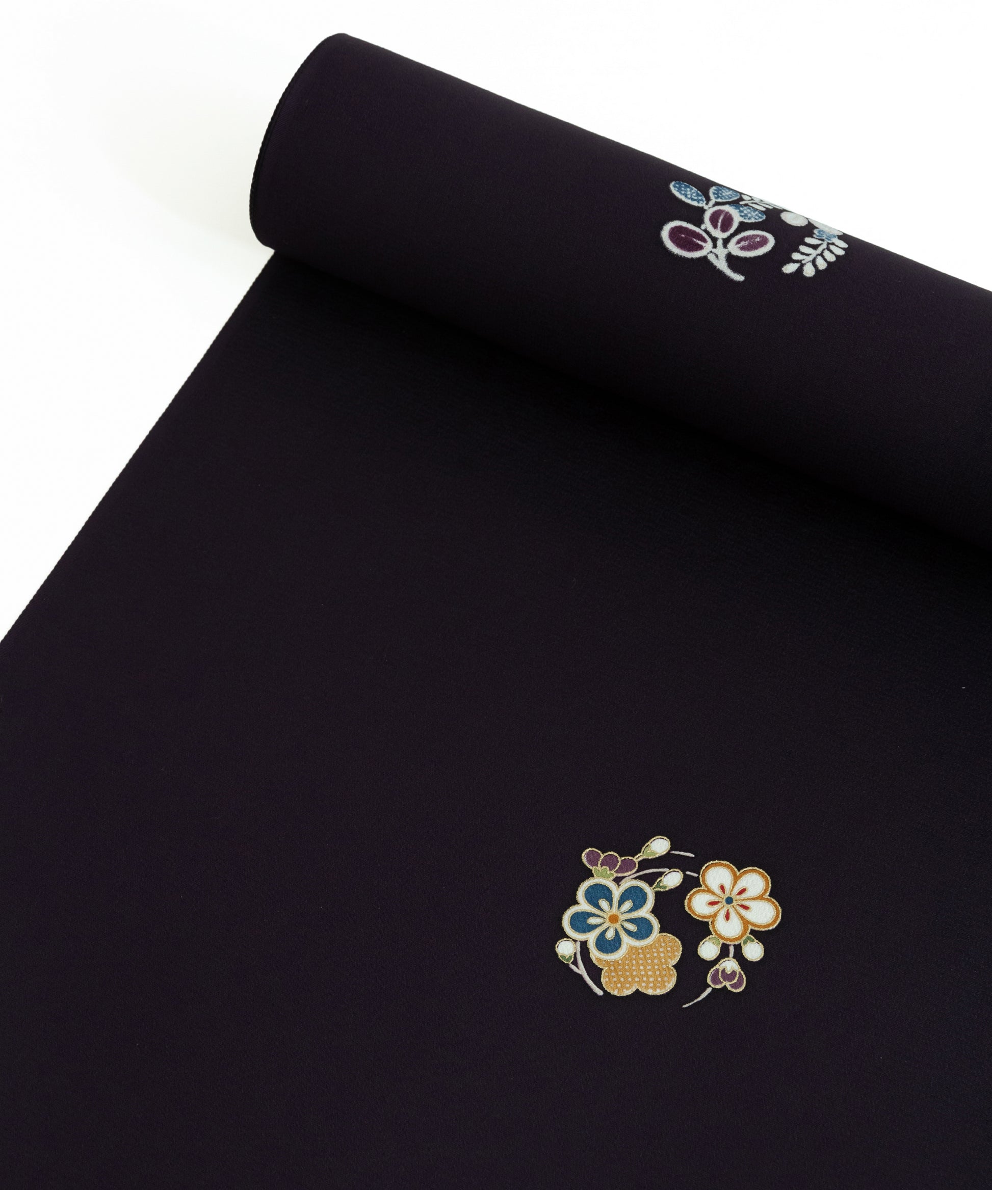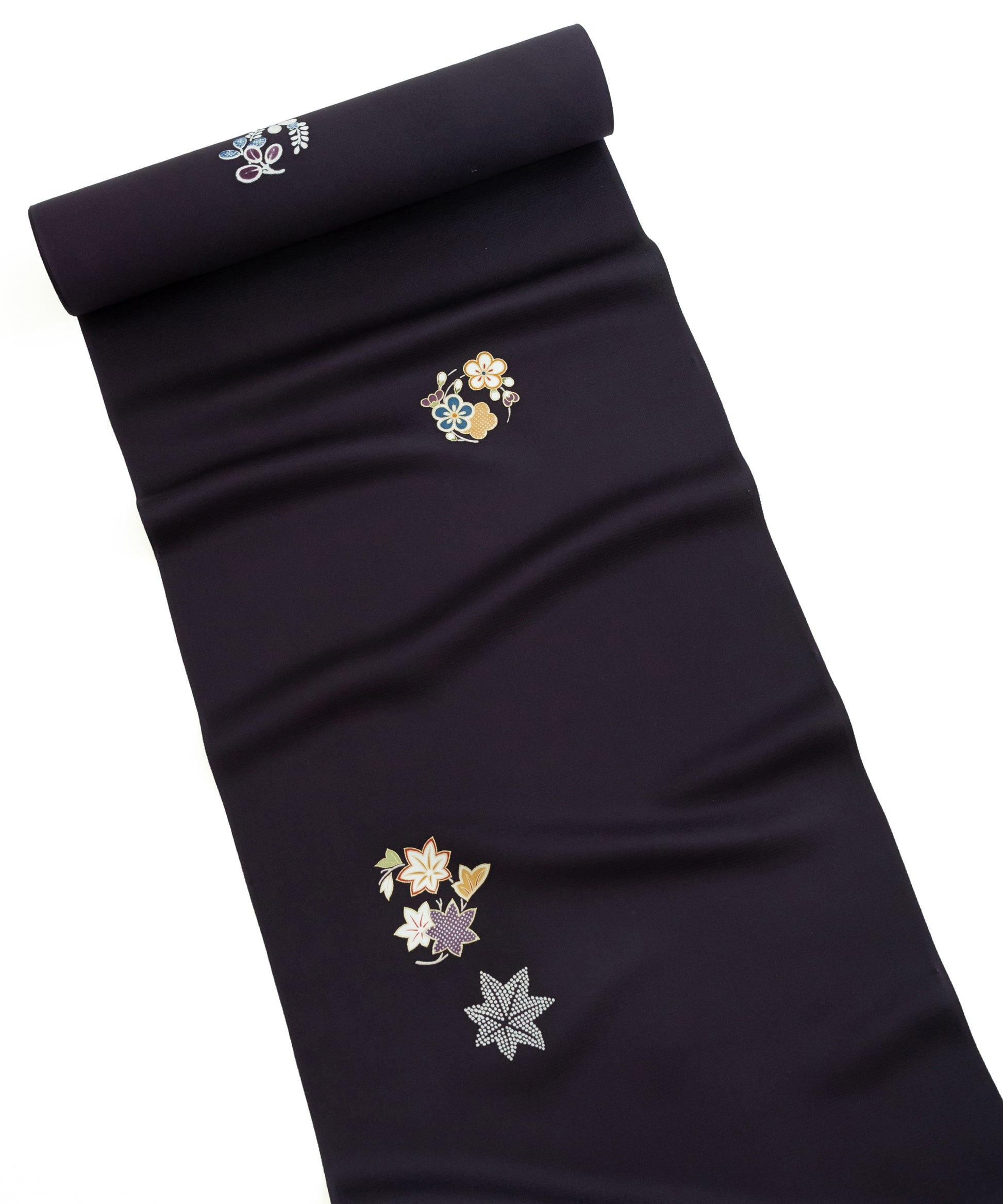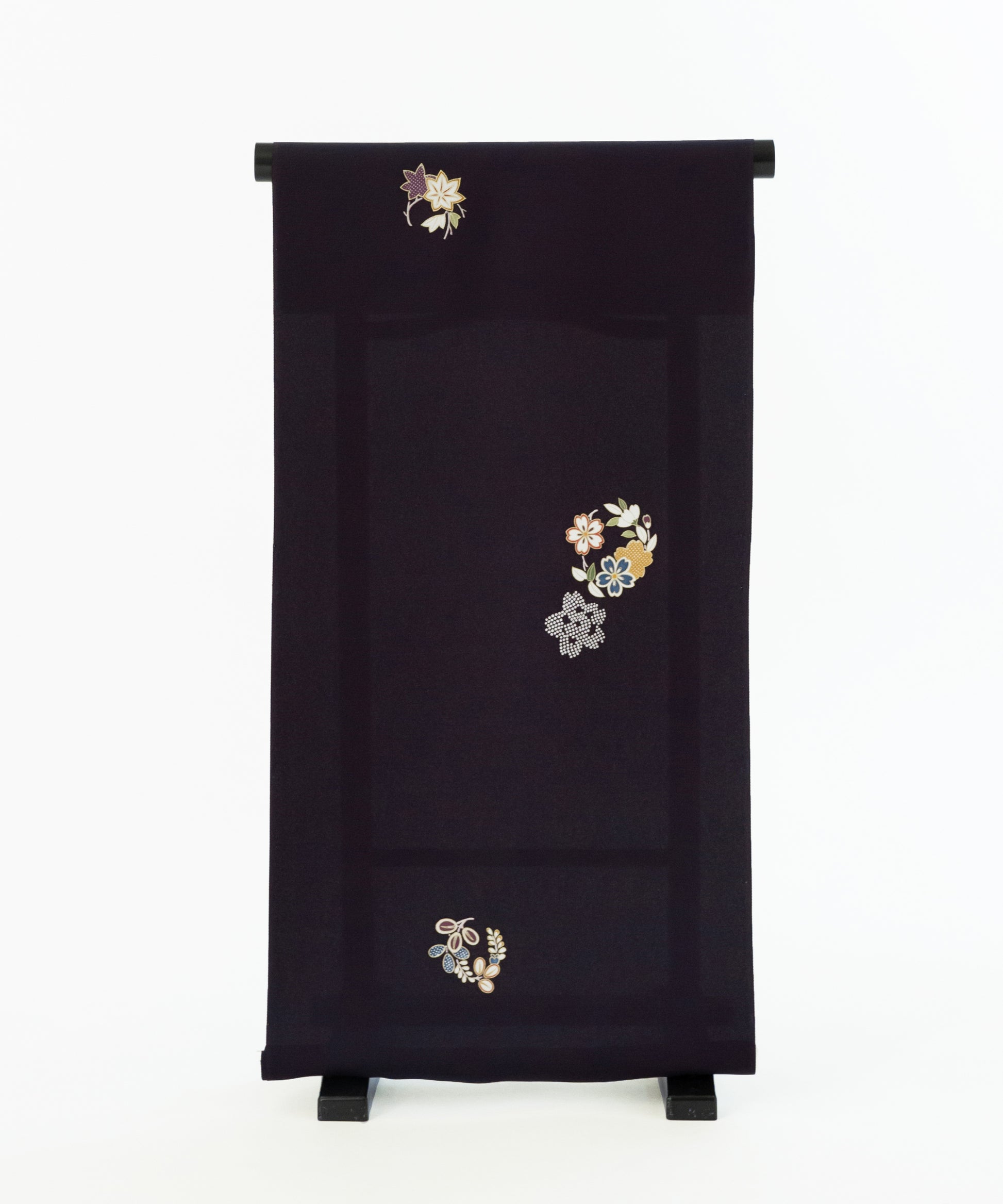 紫紺に四季のお花の飛び柄小紋でございます。丹後ちりめん地の程よい張りのある生地で、光沢は控えめです。普段のお出掛けや、帯次第でお稽古事の出番に活躍する魅力があります。