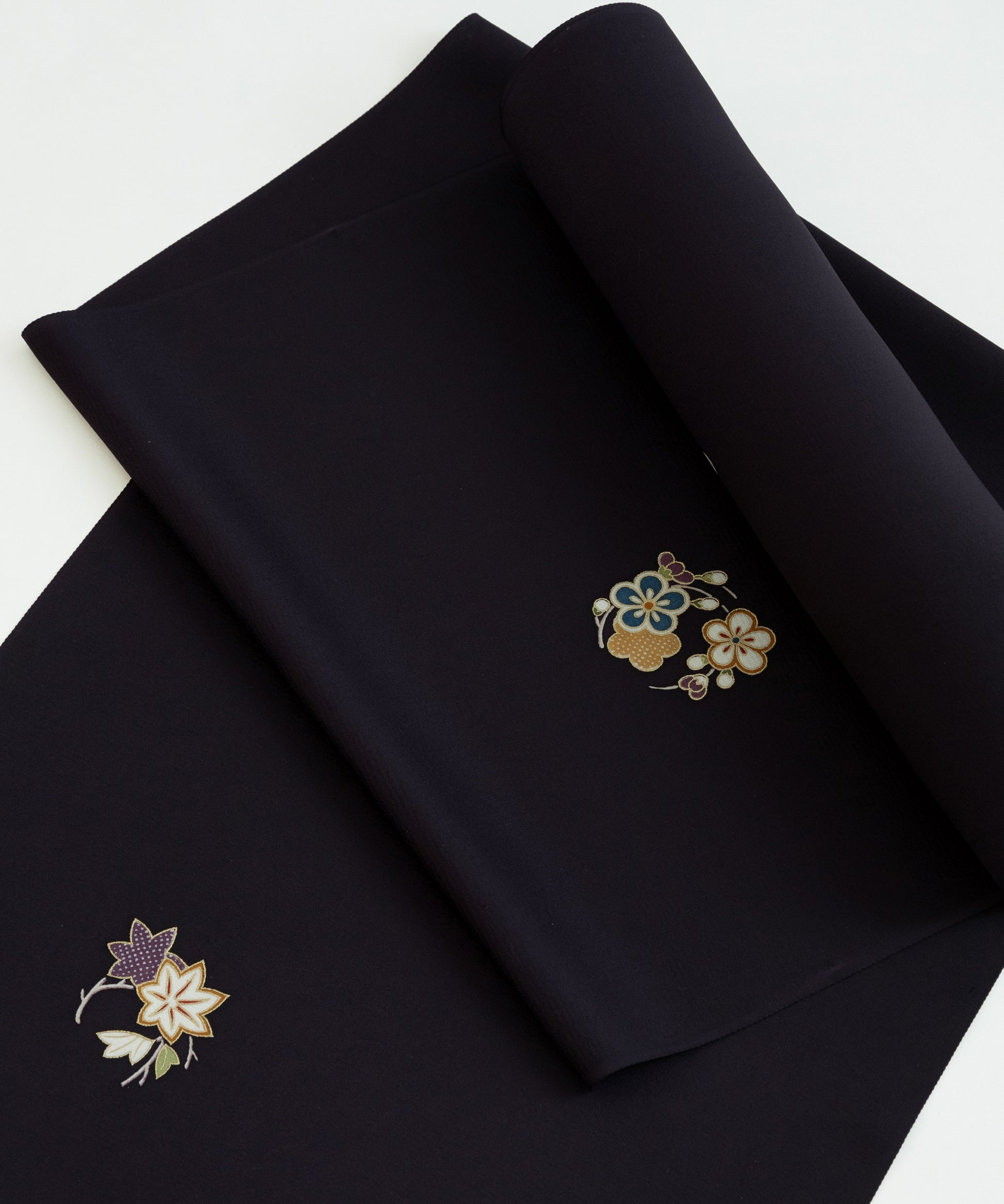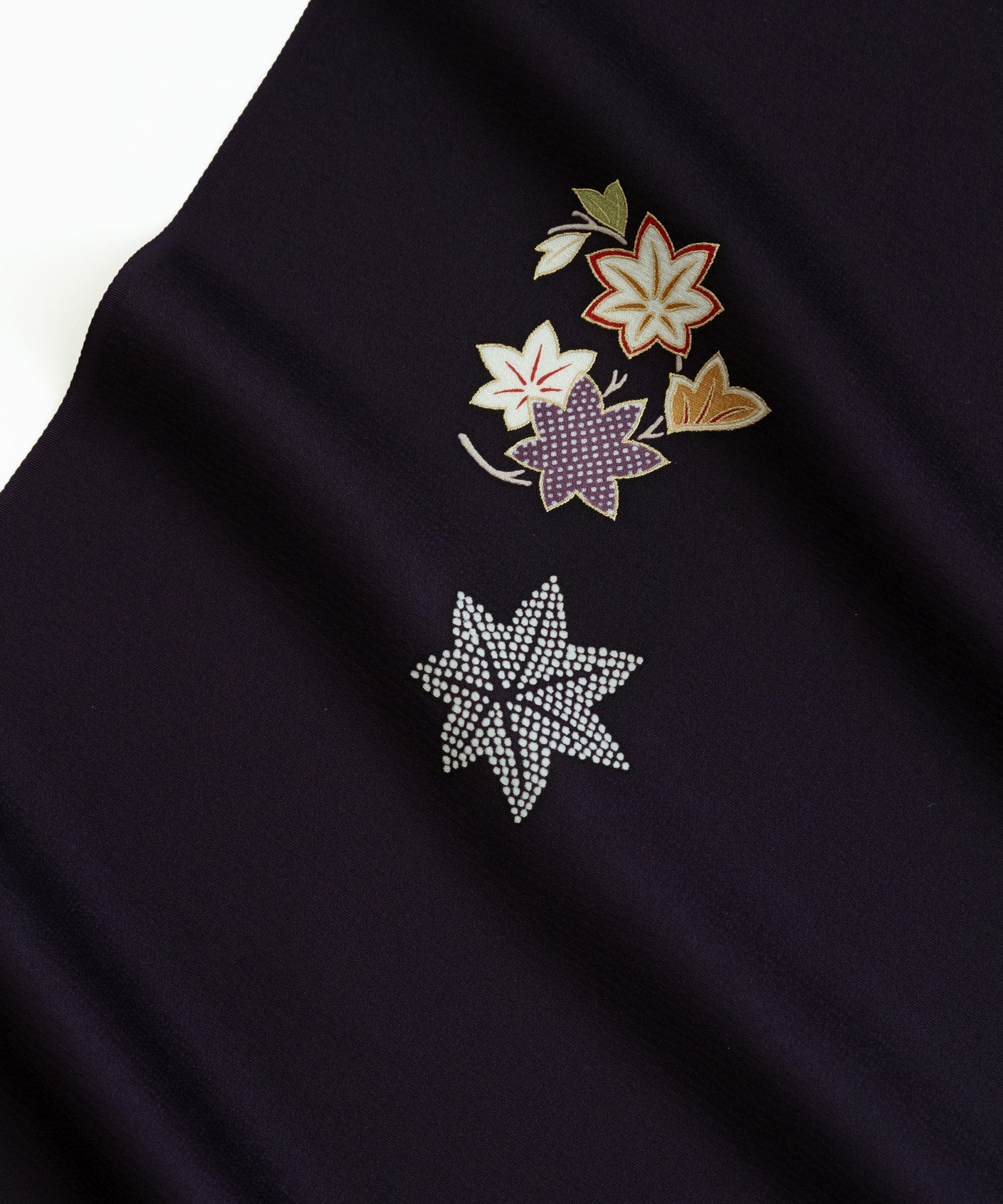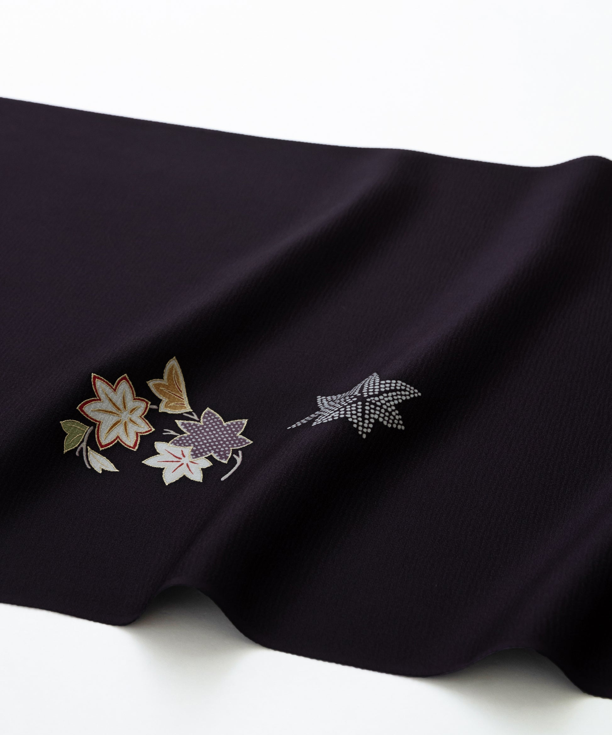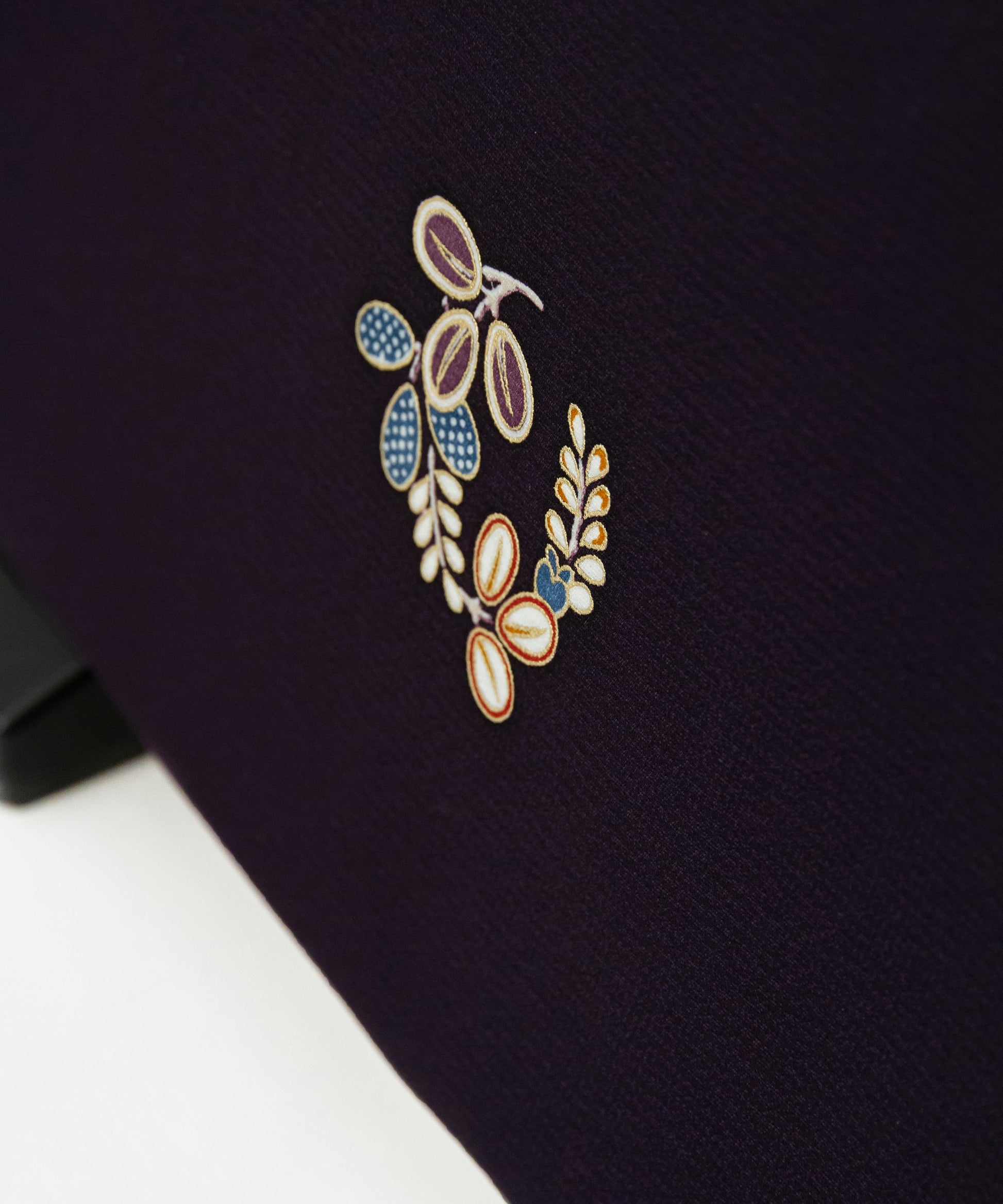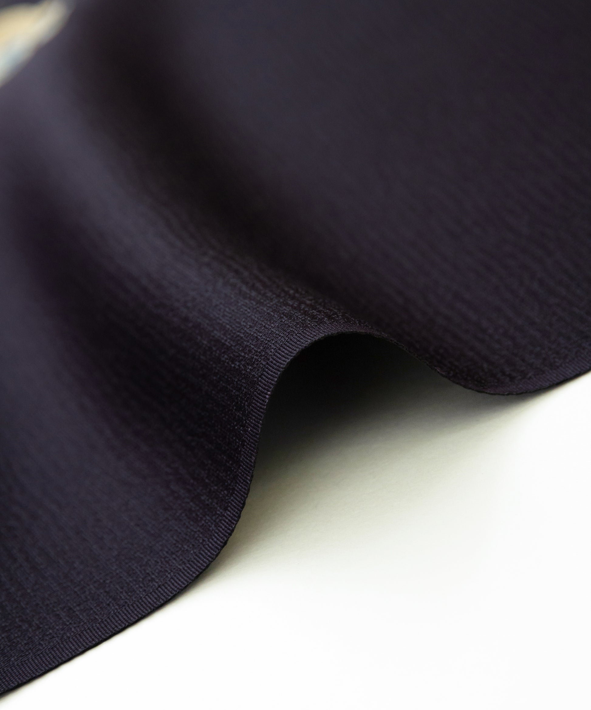 紫紺に四季のお花の飛び柄小紋でございます。丹後ちりめん地の程よい張りのある生地で、光沢は控えめです。普段のお出掛けや、帯次第でお稽古事の出番に活躍する魅力があります。