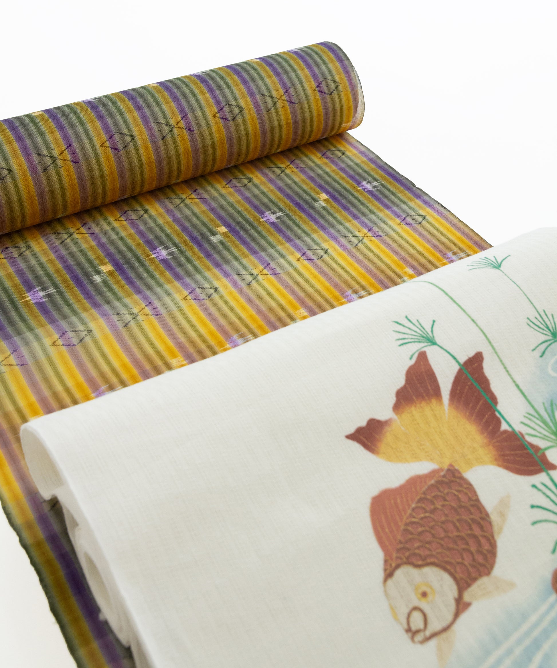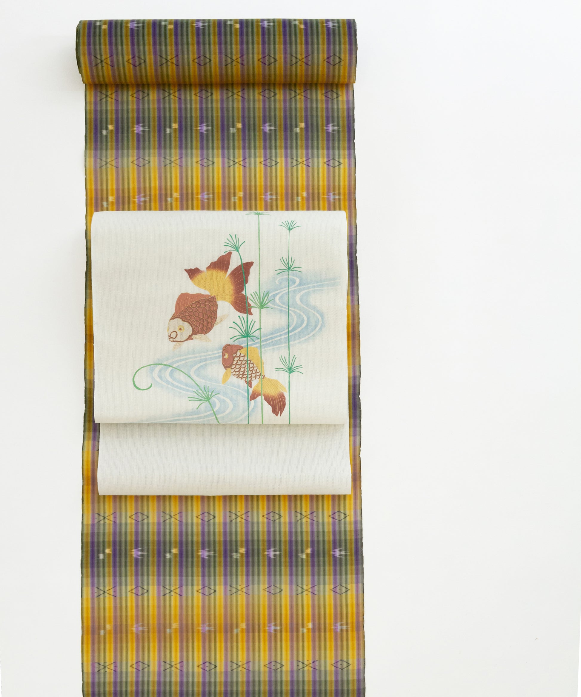 麻地夏九寸名古屋帯「金魚」(5-8枚目)表地57,550円でございます。夏の代名詞、金魚さん。腹柄は水面です。スイスイと泳いでいる雰囲気ですね。涼を呼ぶコーディネートです。