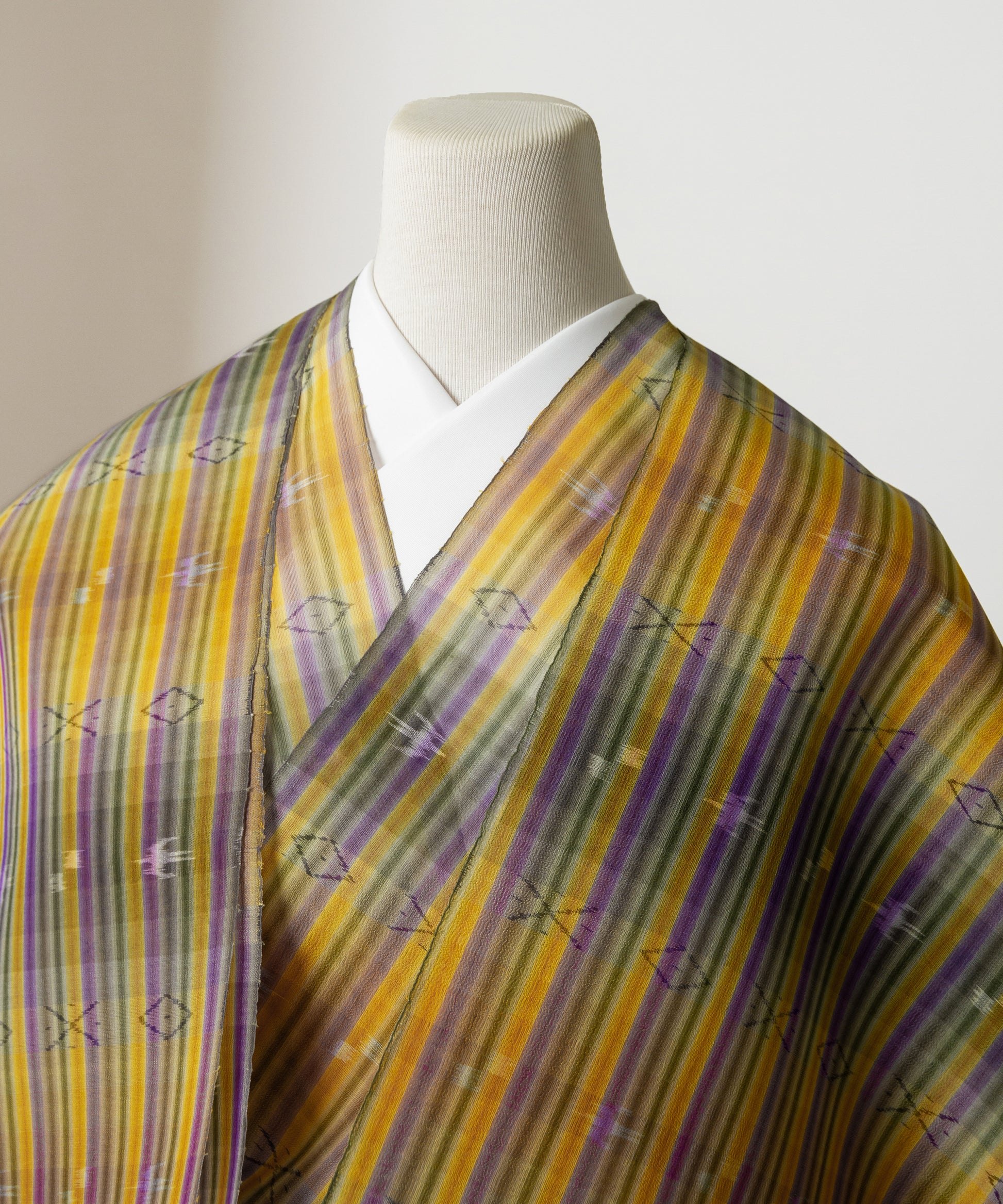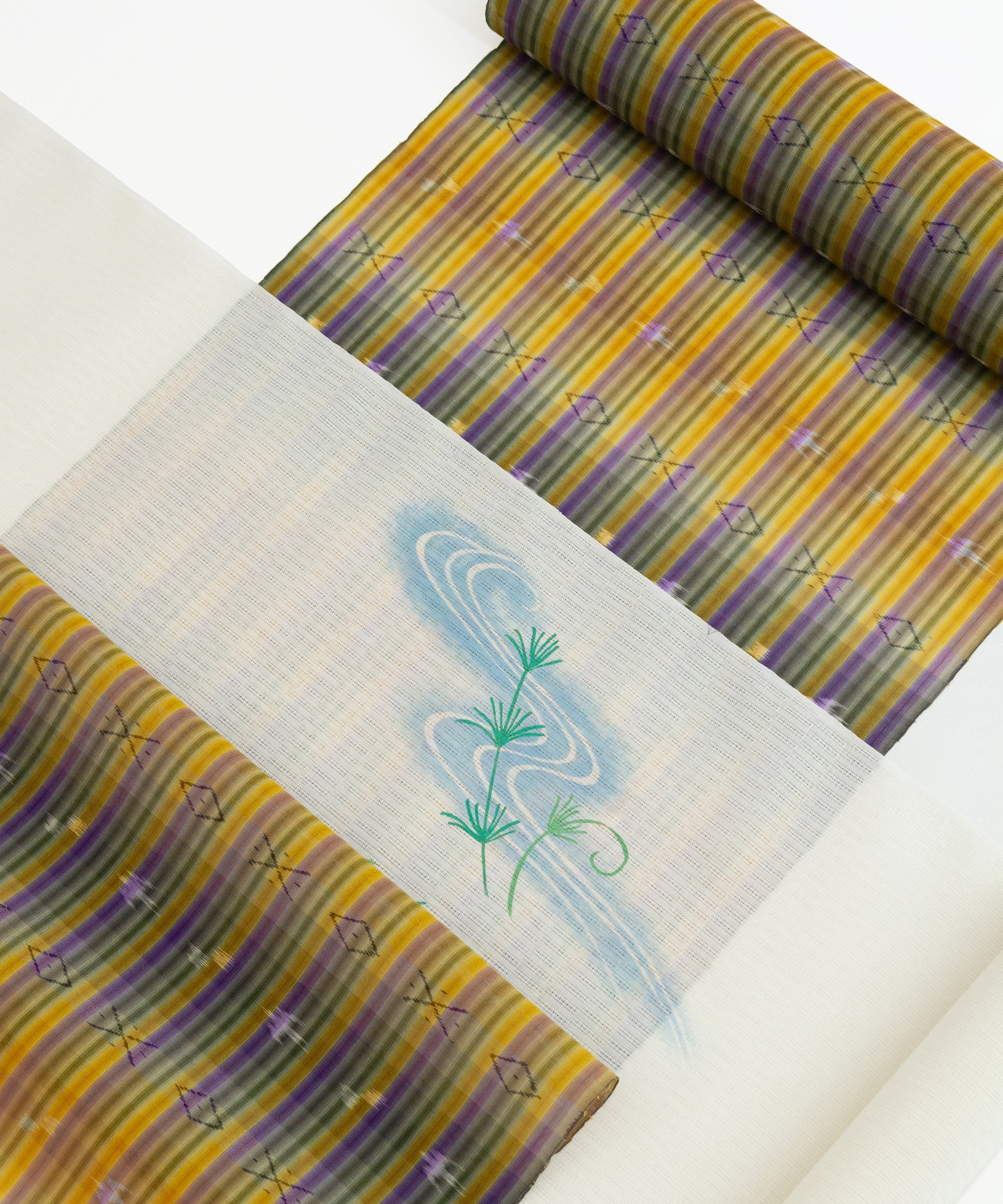 「壁上布」とは、壁糸と言われる強撚糸を緯糸に使い織り上げた、単衣から夏向きの薄織物です。強撚糸がつくる独特なざらっとした絹地の感触が特徴であり、初夏から真夏、残暑の頃まで長くお召しになれる、体にまとわりつかないスキッとした着心地で着姿も涼やかなお召し物でございます。