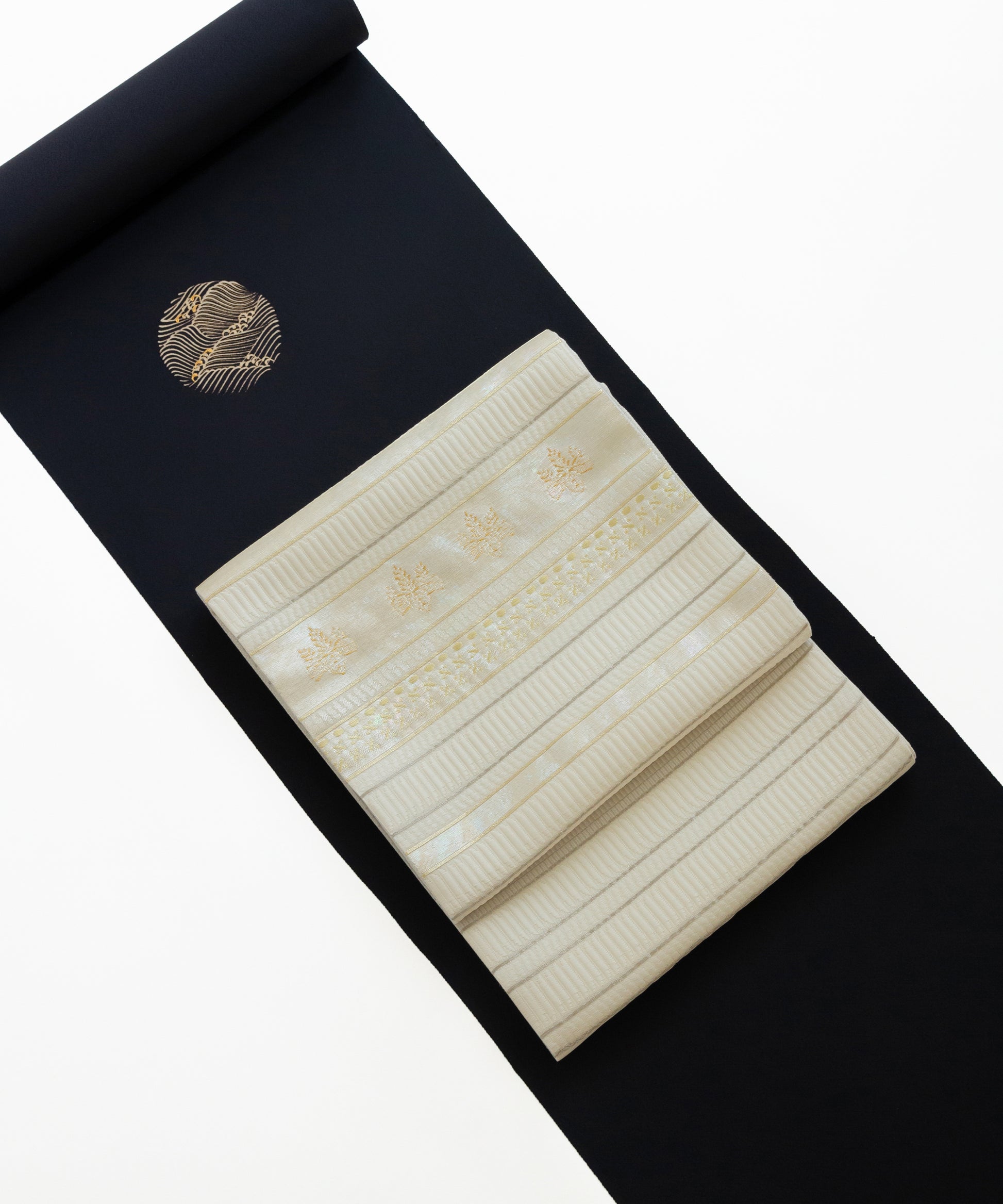 濃い紺地に金で描かれた「波の丸」。ドレッシーな装いの場面に、ぜひおすすめでございます。こちらもぜひお気軽にお問い合わせくださいませ。