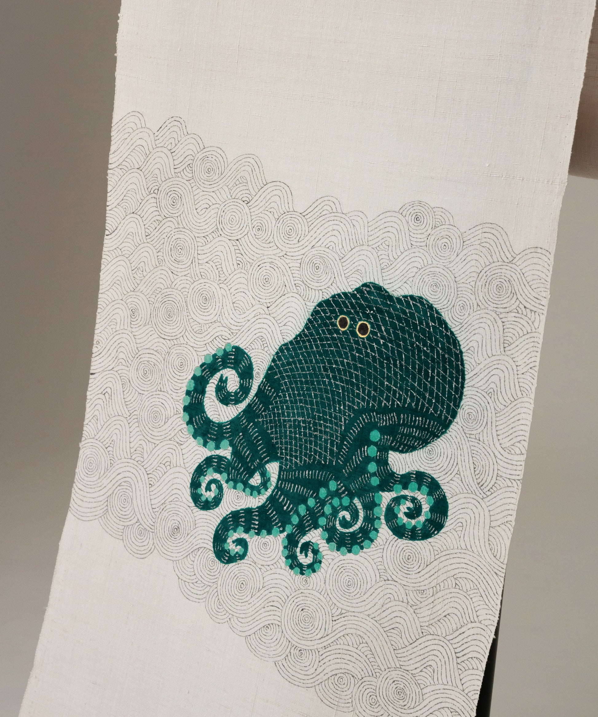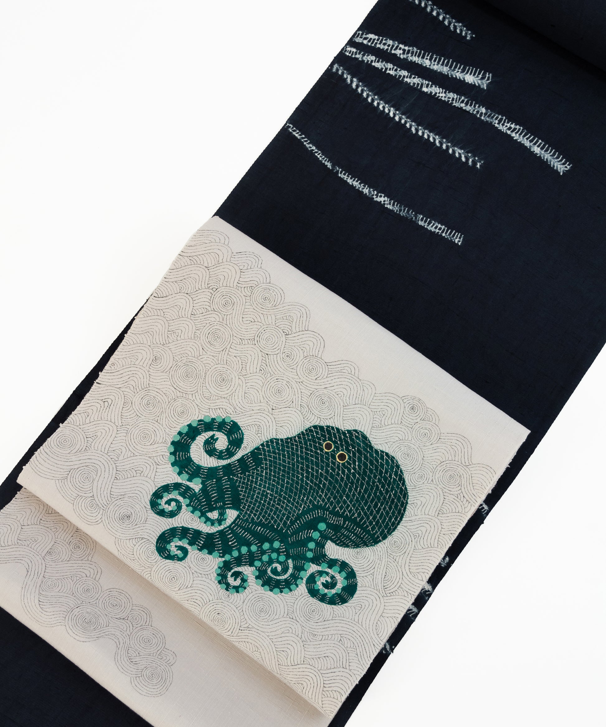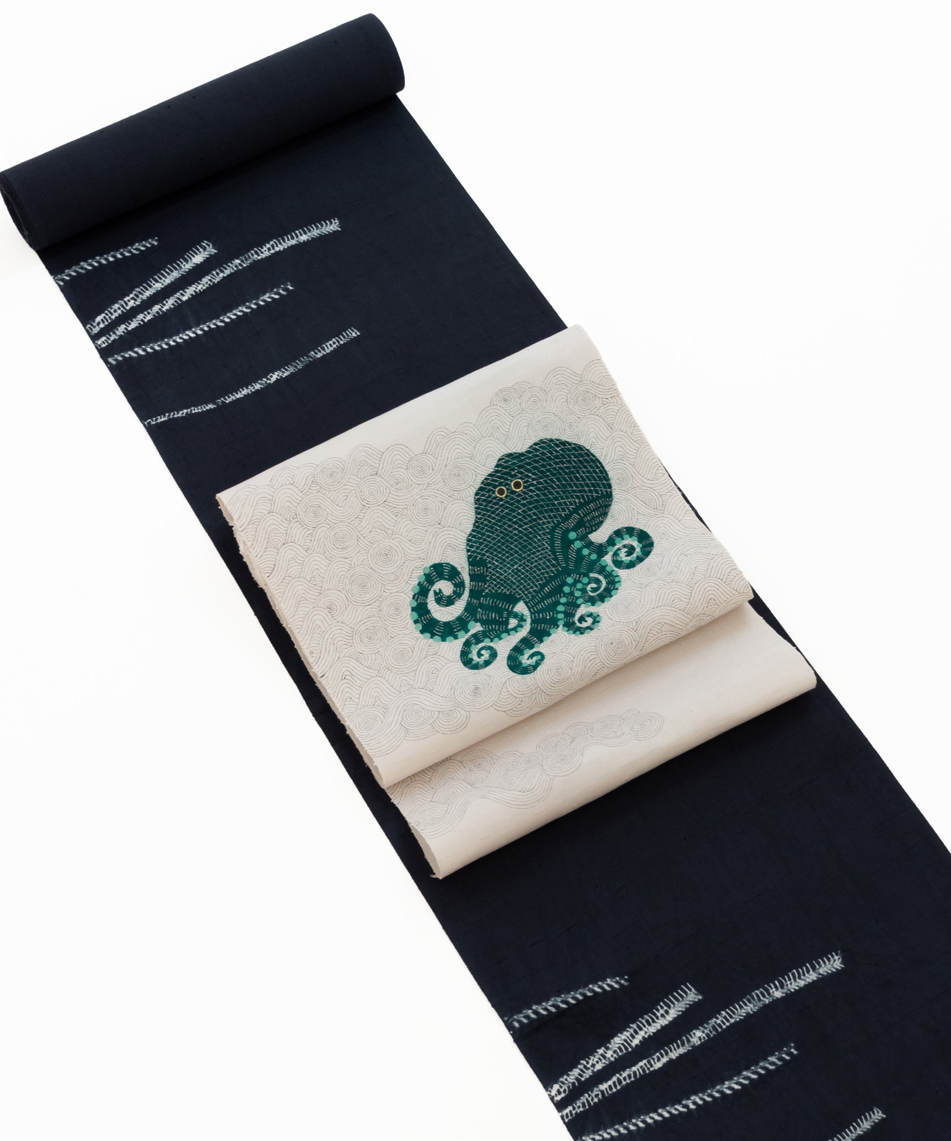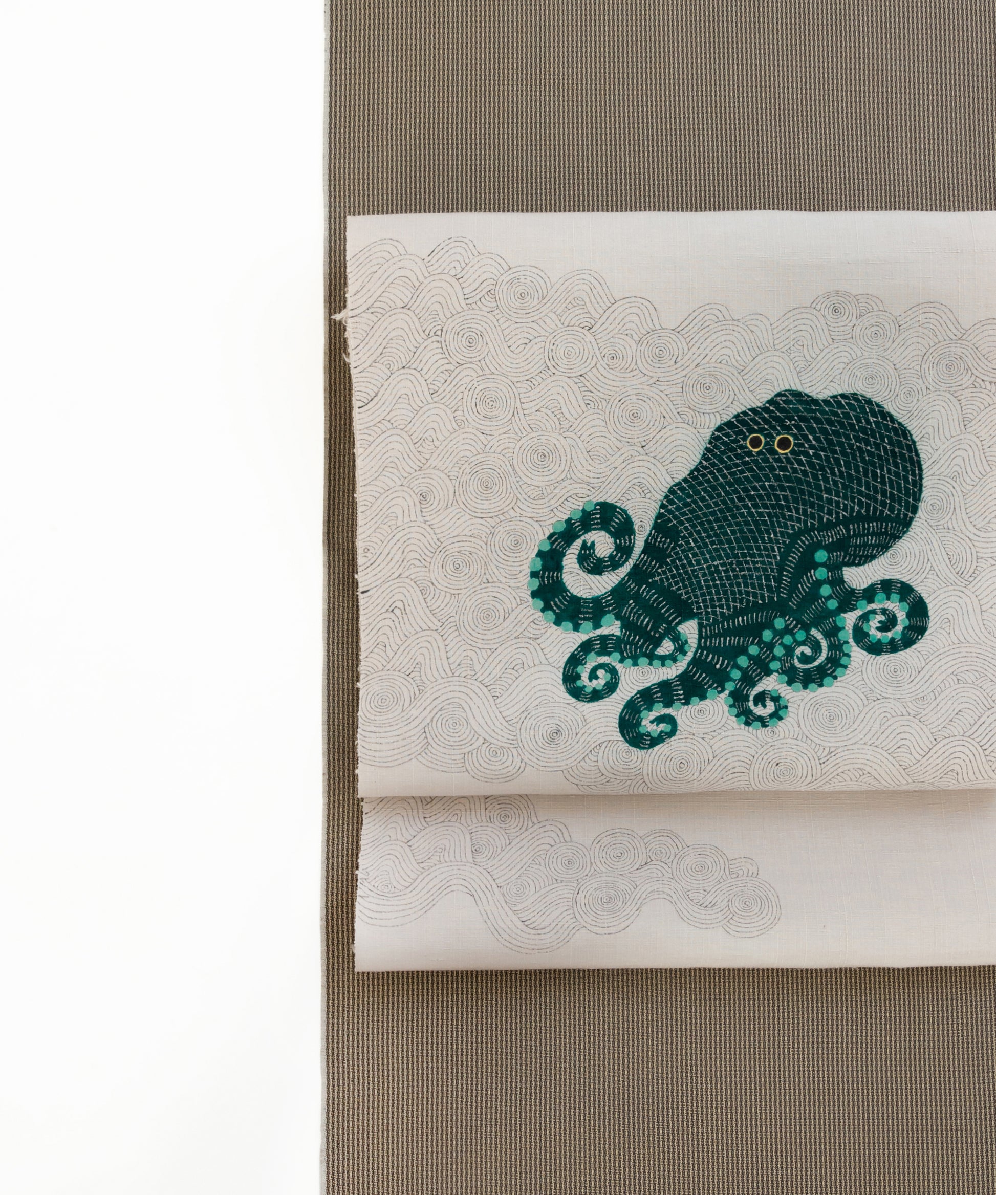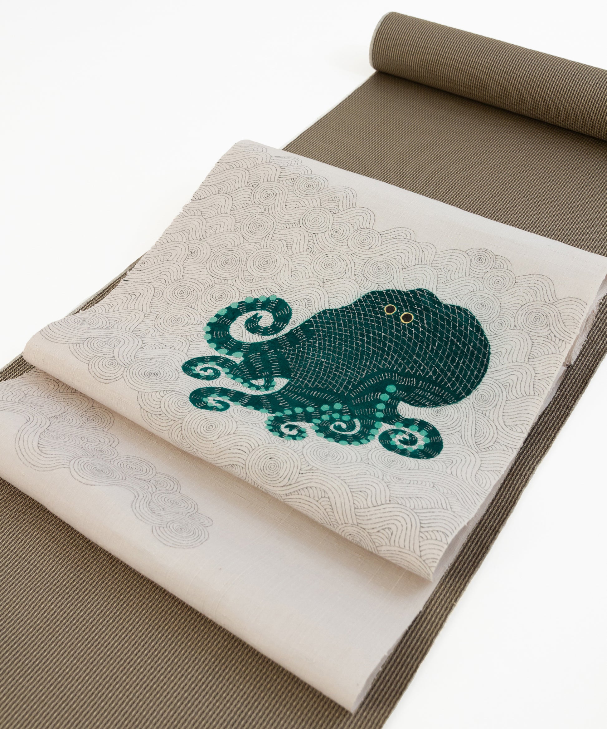 そしてこの度の蛸の小太郎は深い青緑色で一段と個性と存在感を増した感じがいたします。帯生地も単衣、袷に適した小千谷紬を使用しております。