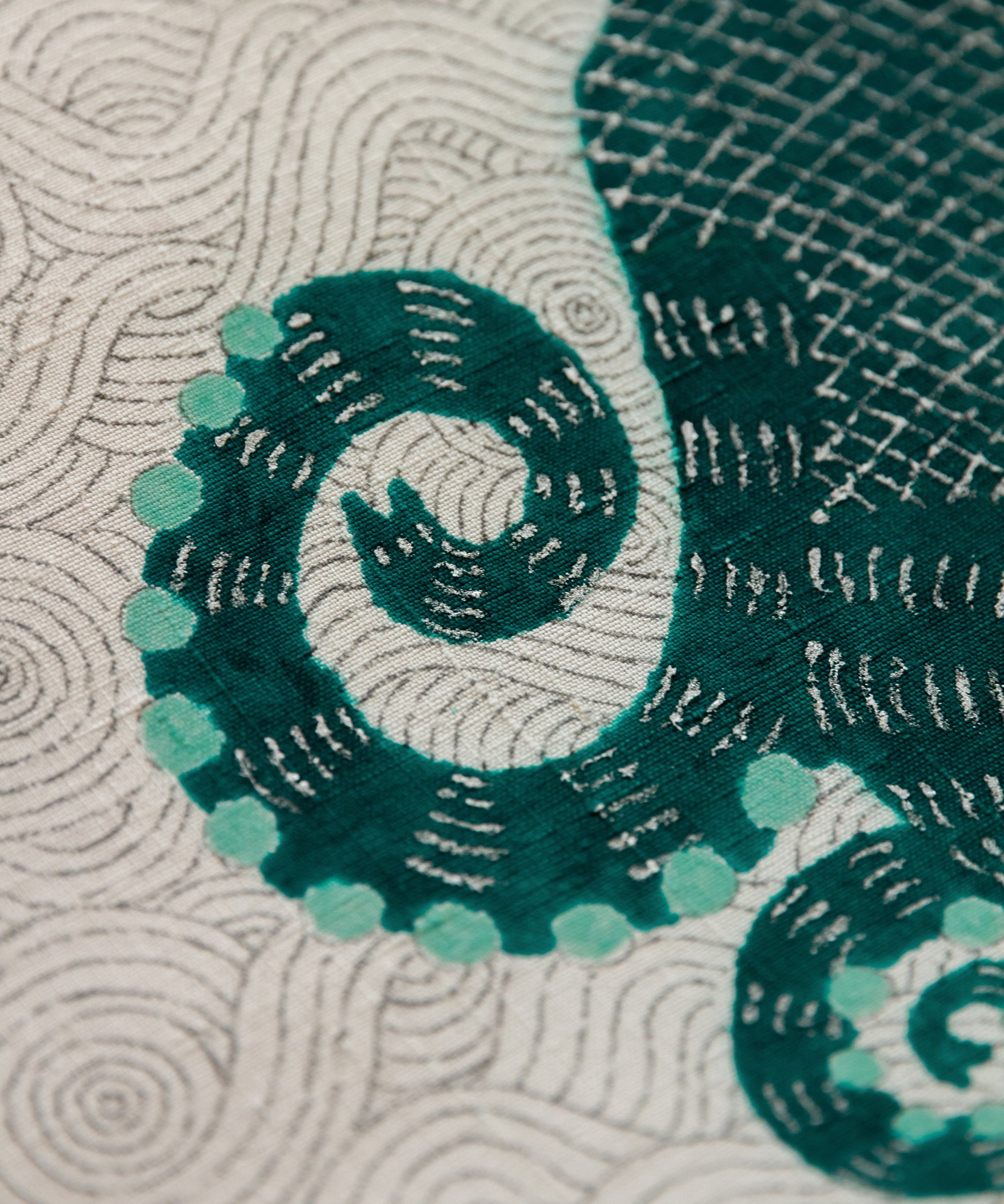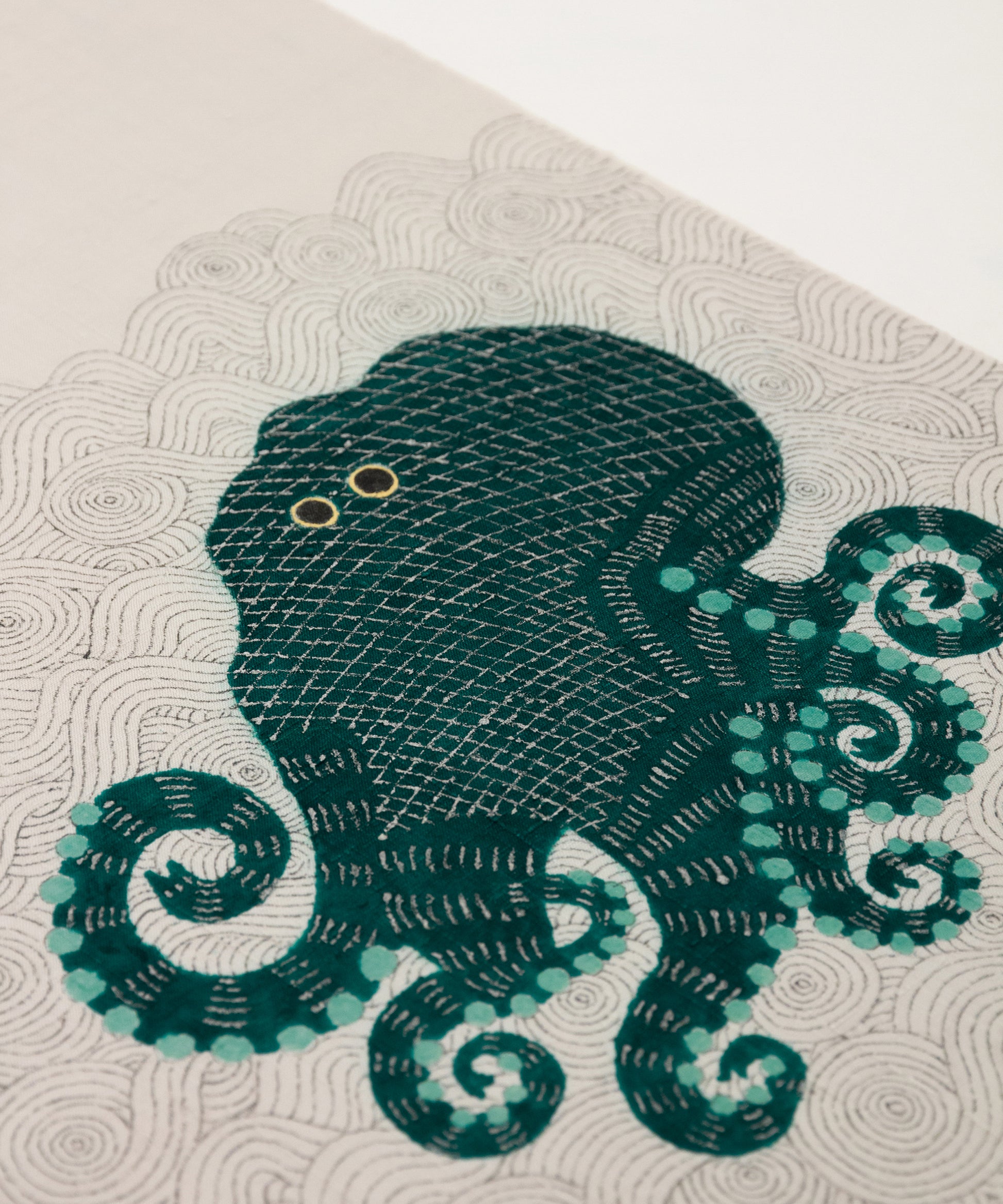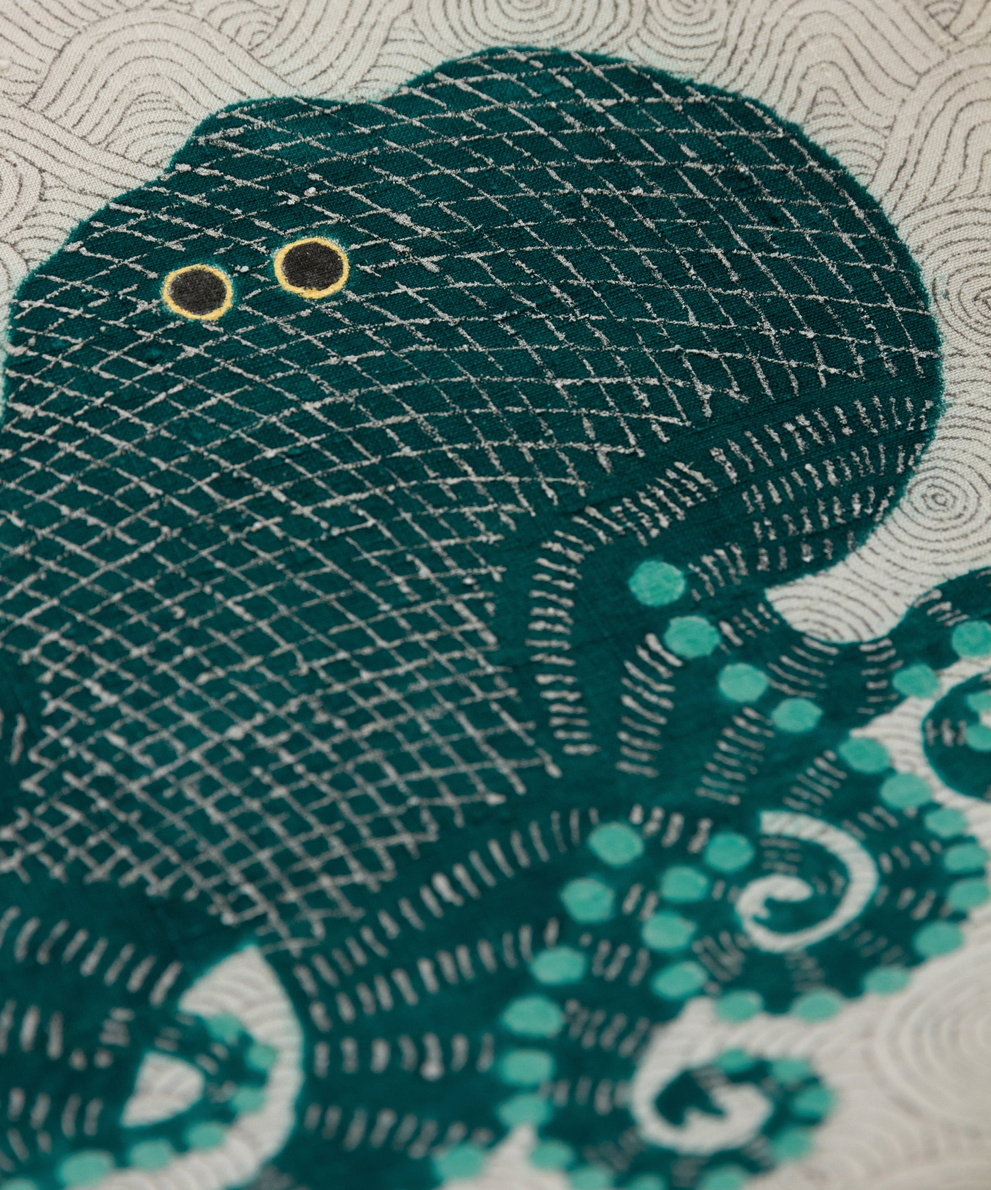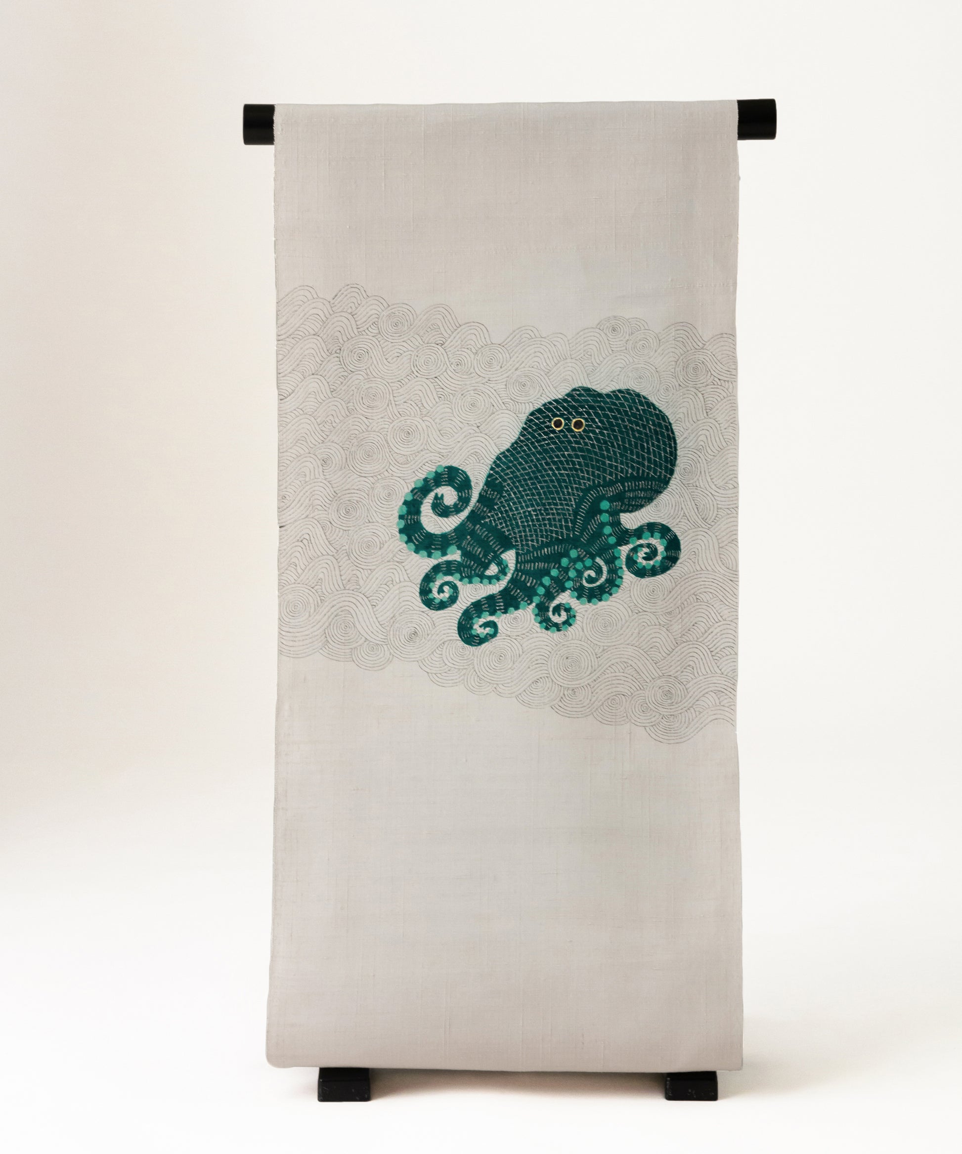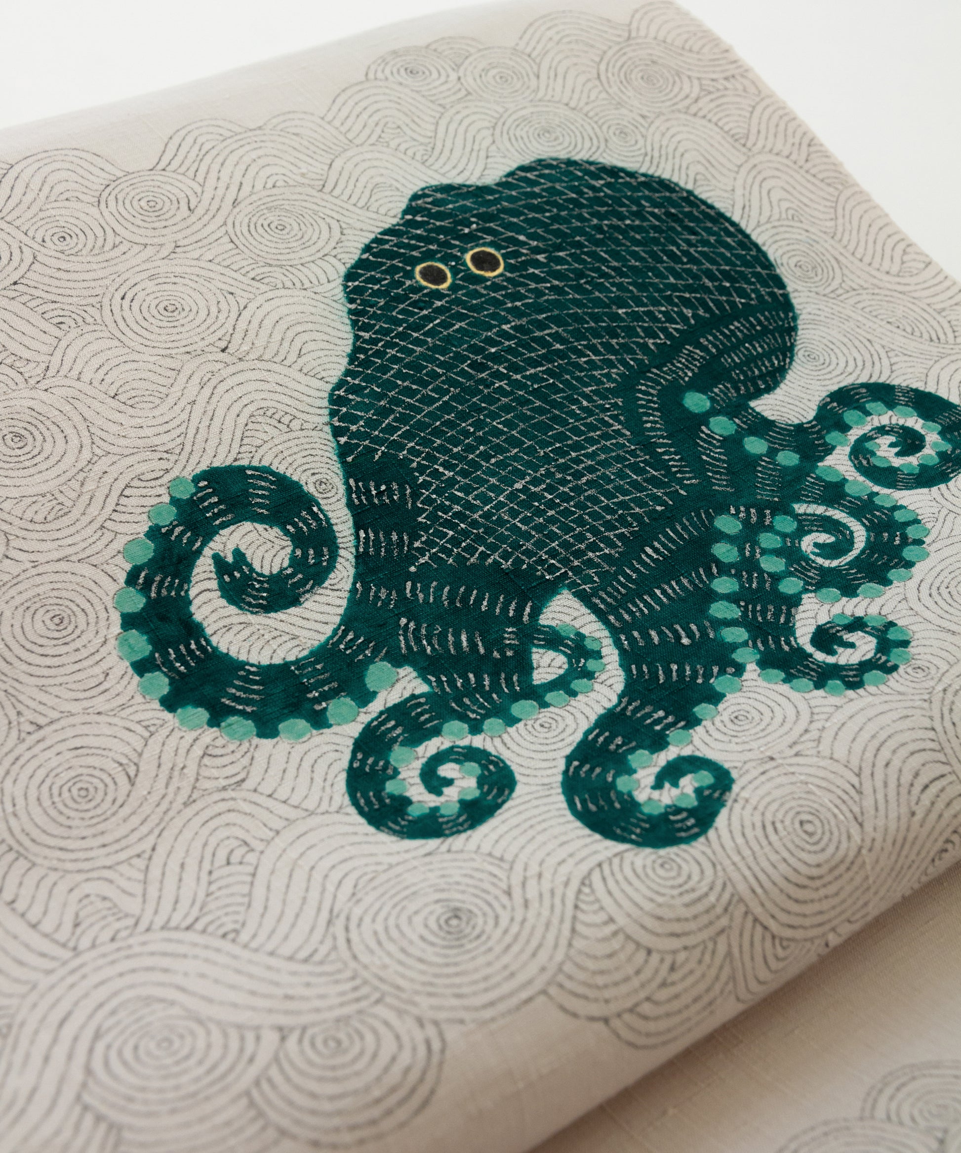 そしてこの度の蛸の小太郎は深い青緑色で一段と個性と存在感を増した感じがいたします。帯生地も単衣、袷に適した小千谷紬を使用しております。