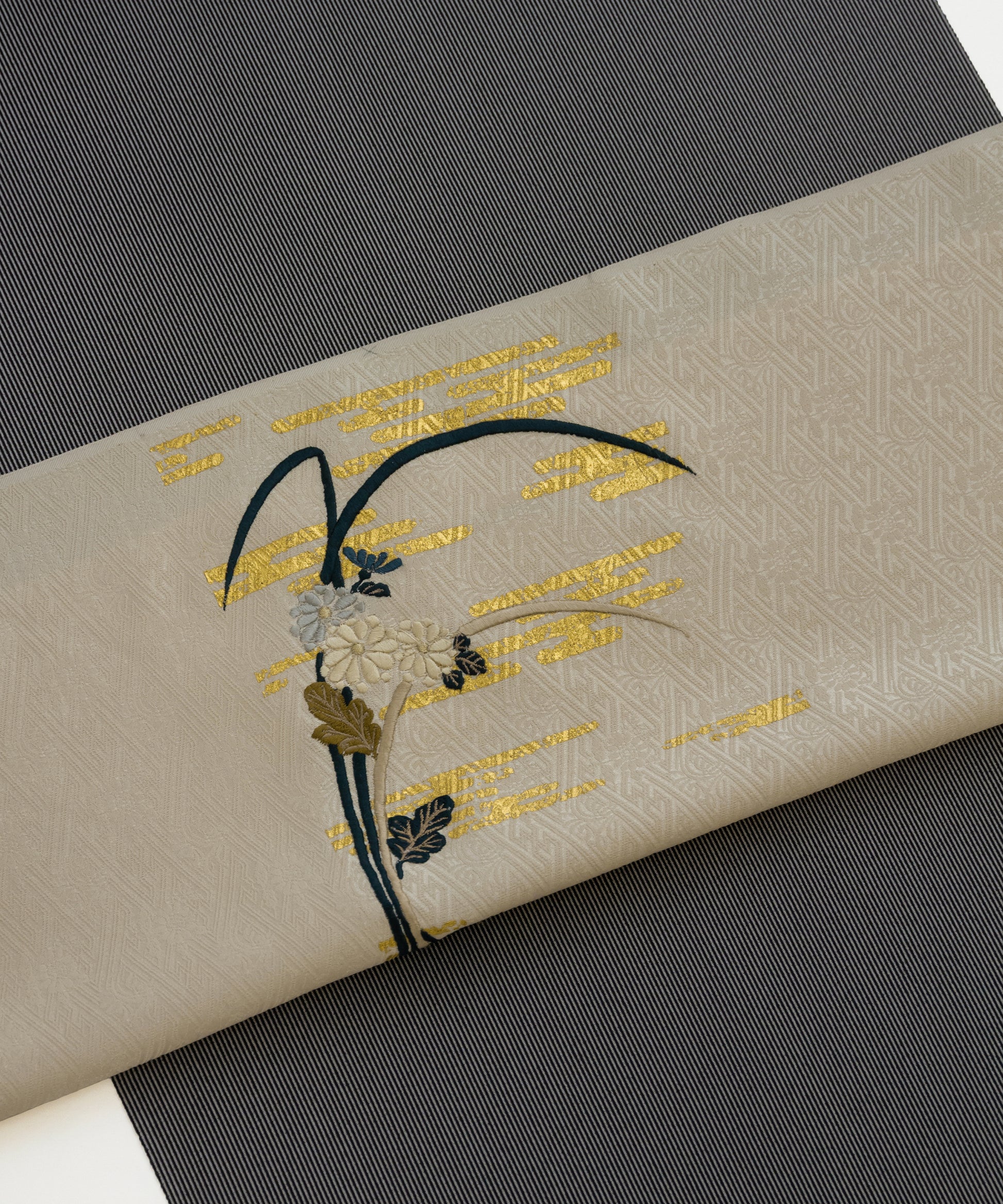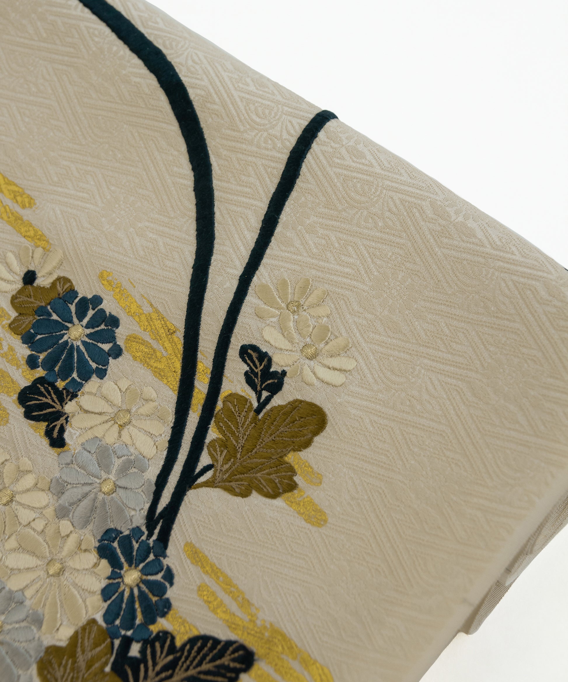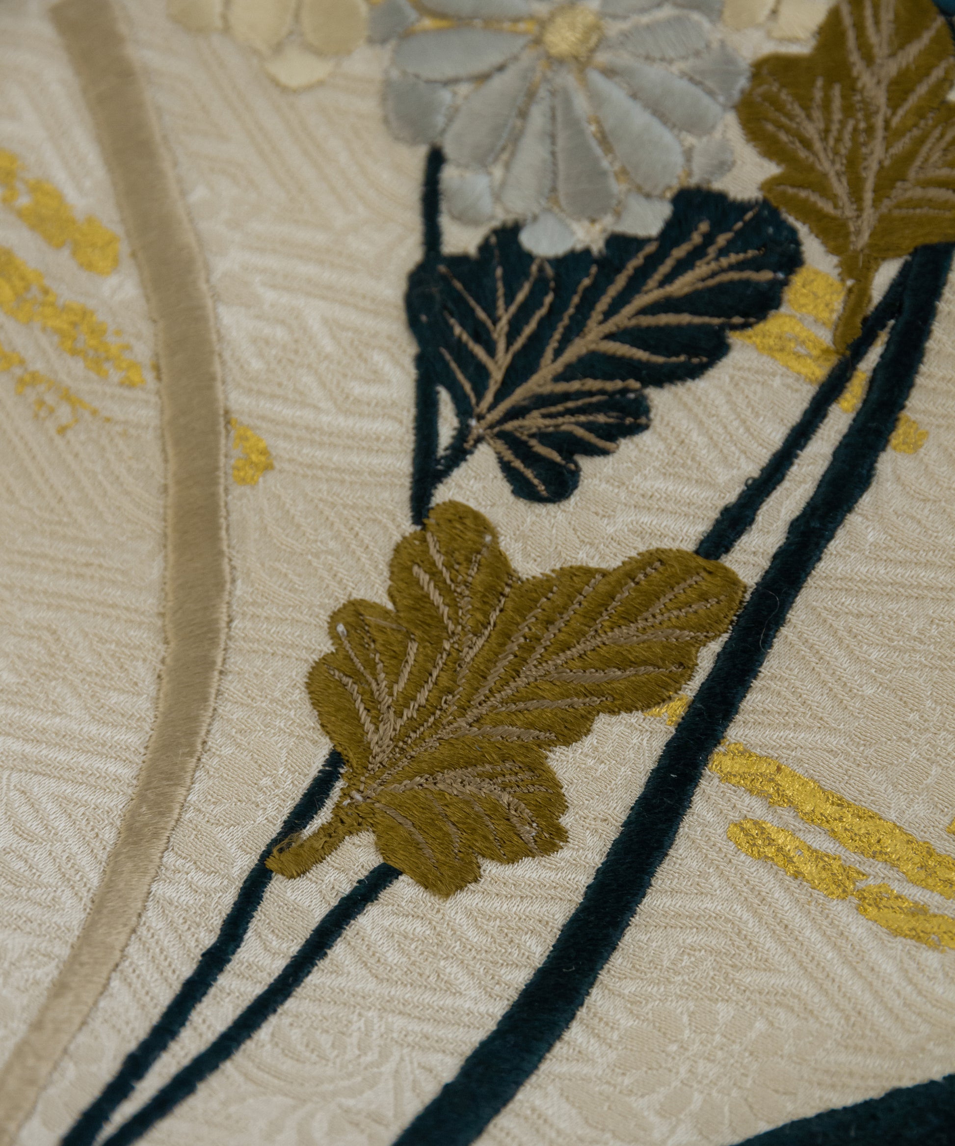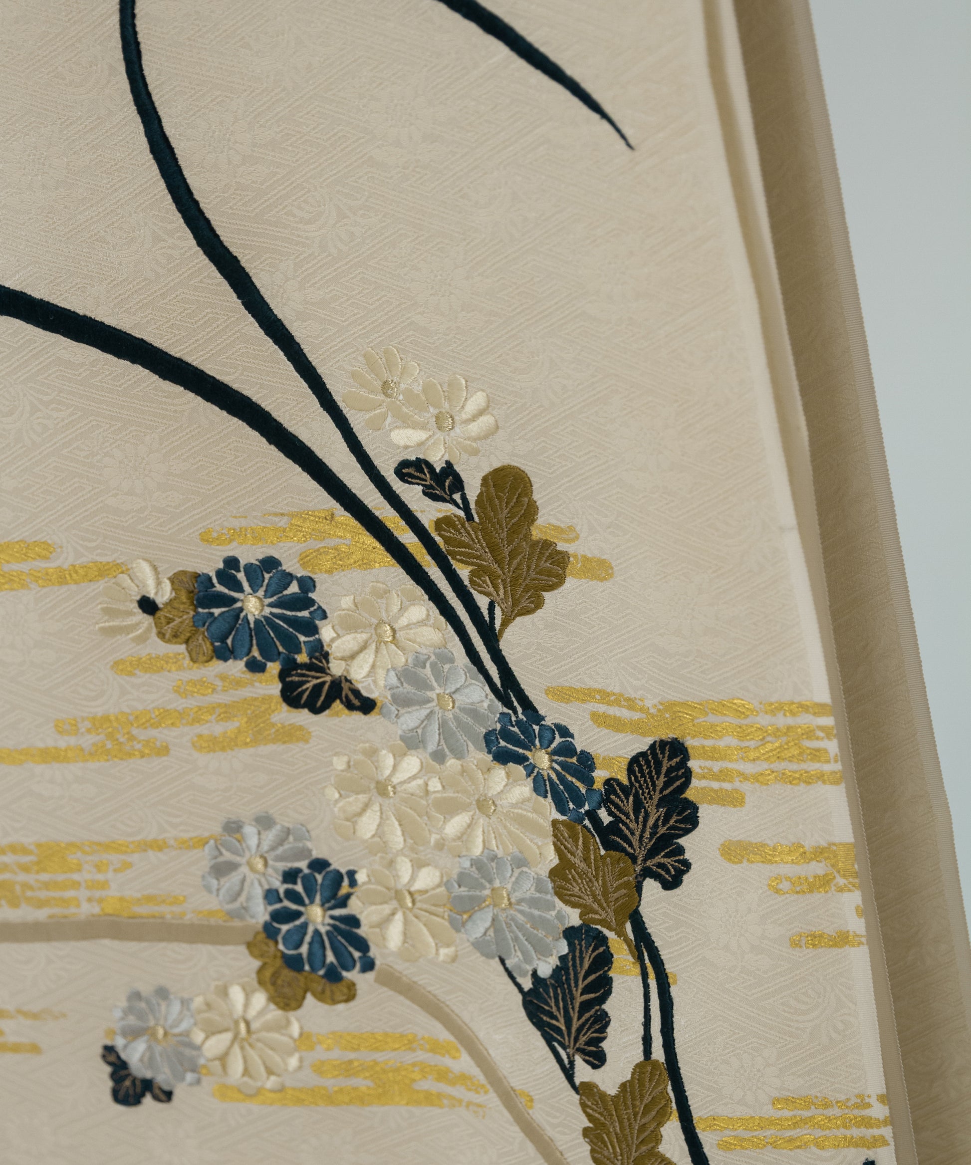こちらの作品は白茶色に染められた紗綾形が地紋となり、金彩と刺繍で菊と芒が繊細に描かれております。江戸時代初期に流行した、刺繍や箔などを組み合わせて、当時の職人が技術を競い合い、より美しい情景を表現しつづけてきた日本の伝統的な柄です。