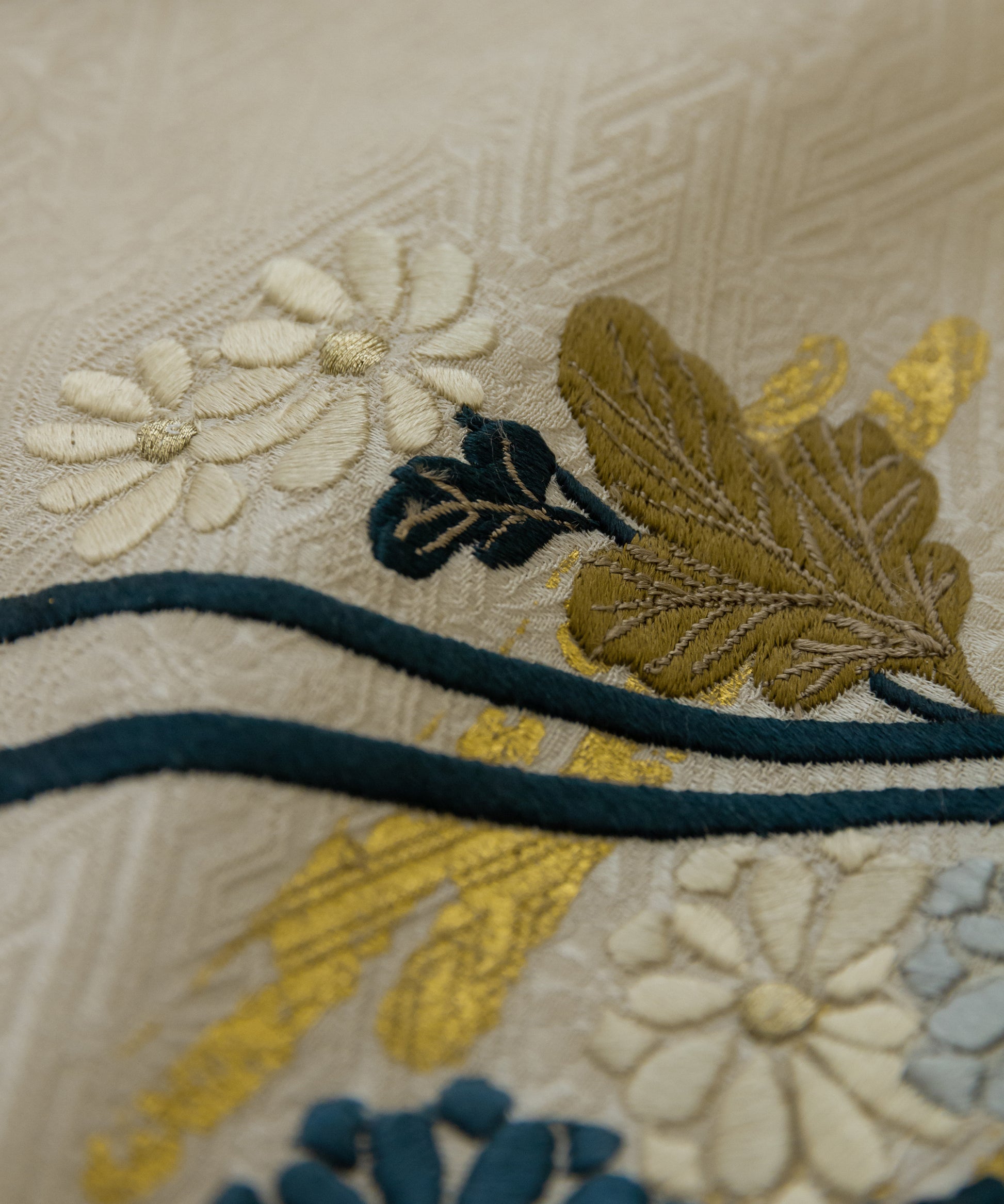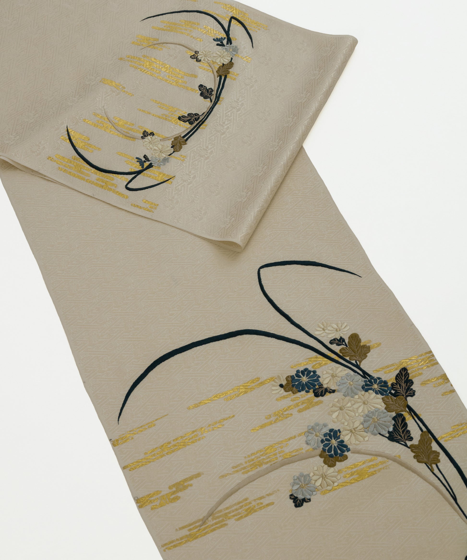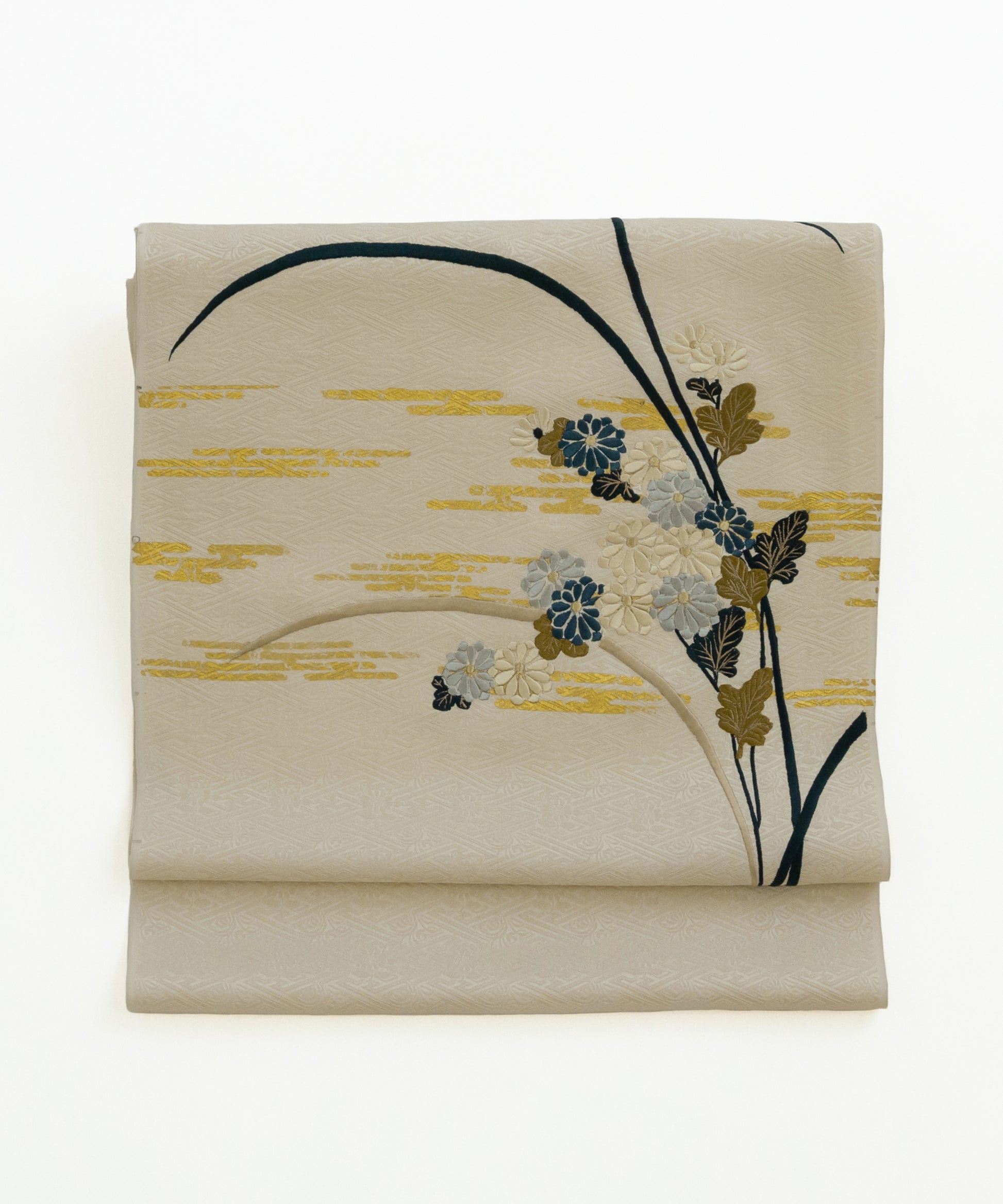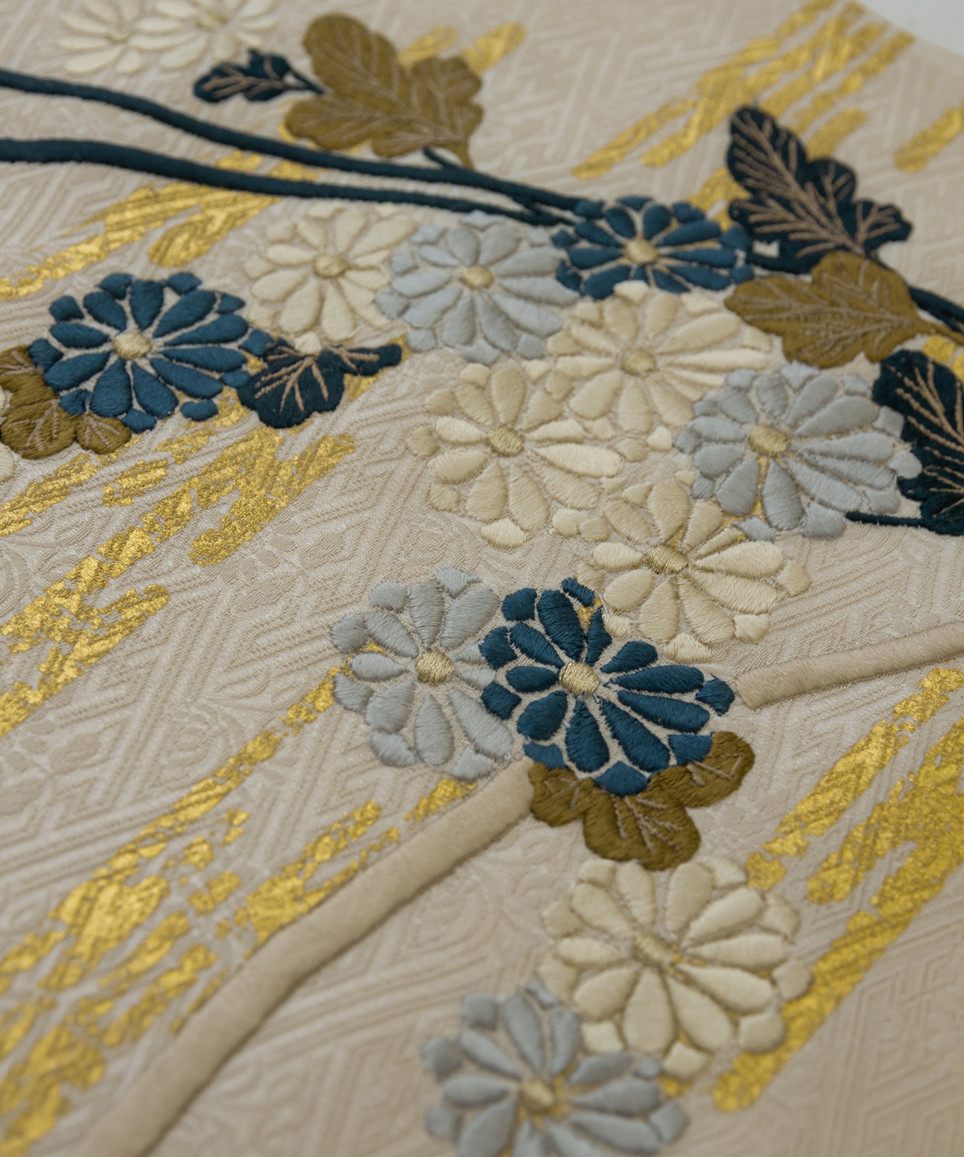 こちらの作品は白茶色に染められた紗綾形が地紋となり、金彩と刺繍で菊と芒が繊細に描かれております。江戸時代初期に流行した、刺繍や箔などを組み合わせて、当時の職人が技術を競い合い、より美しい情景を表現しつづけてきた日本の伝統的な柄です。