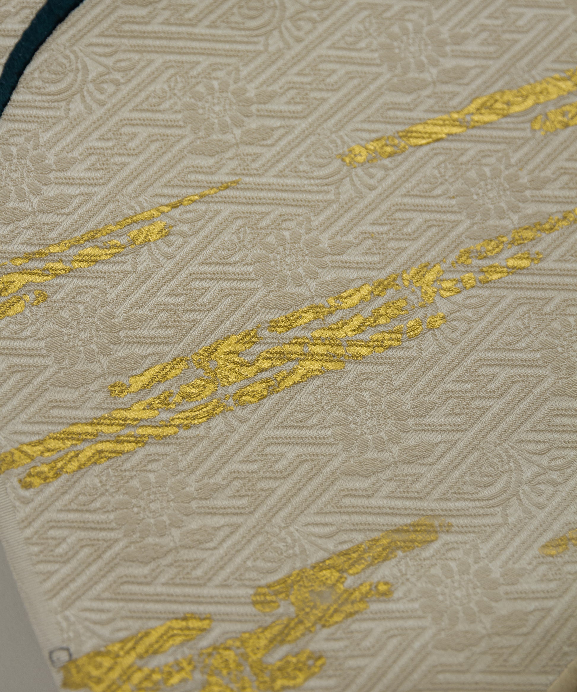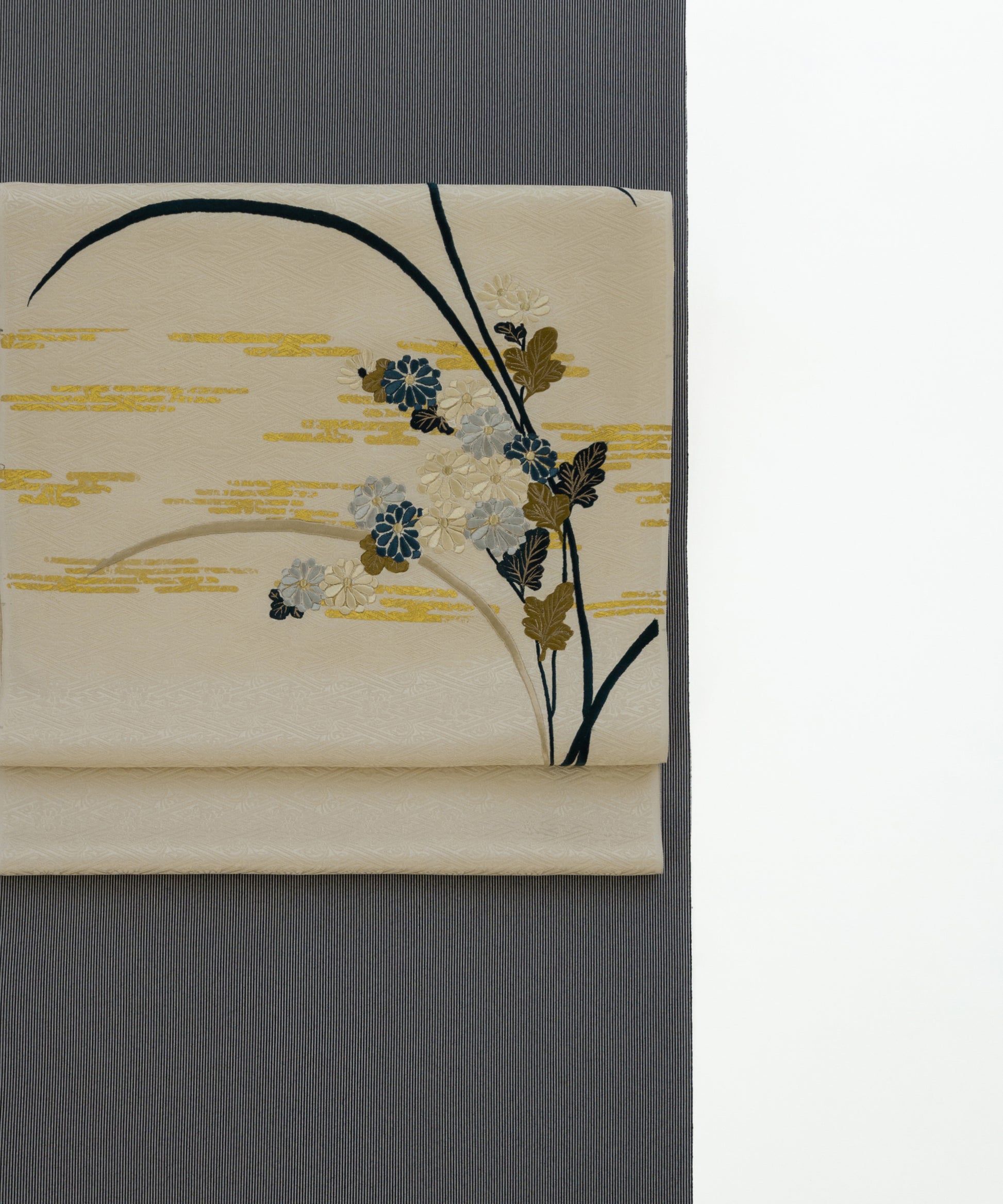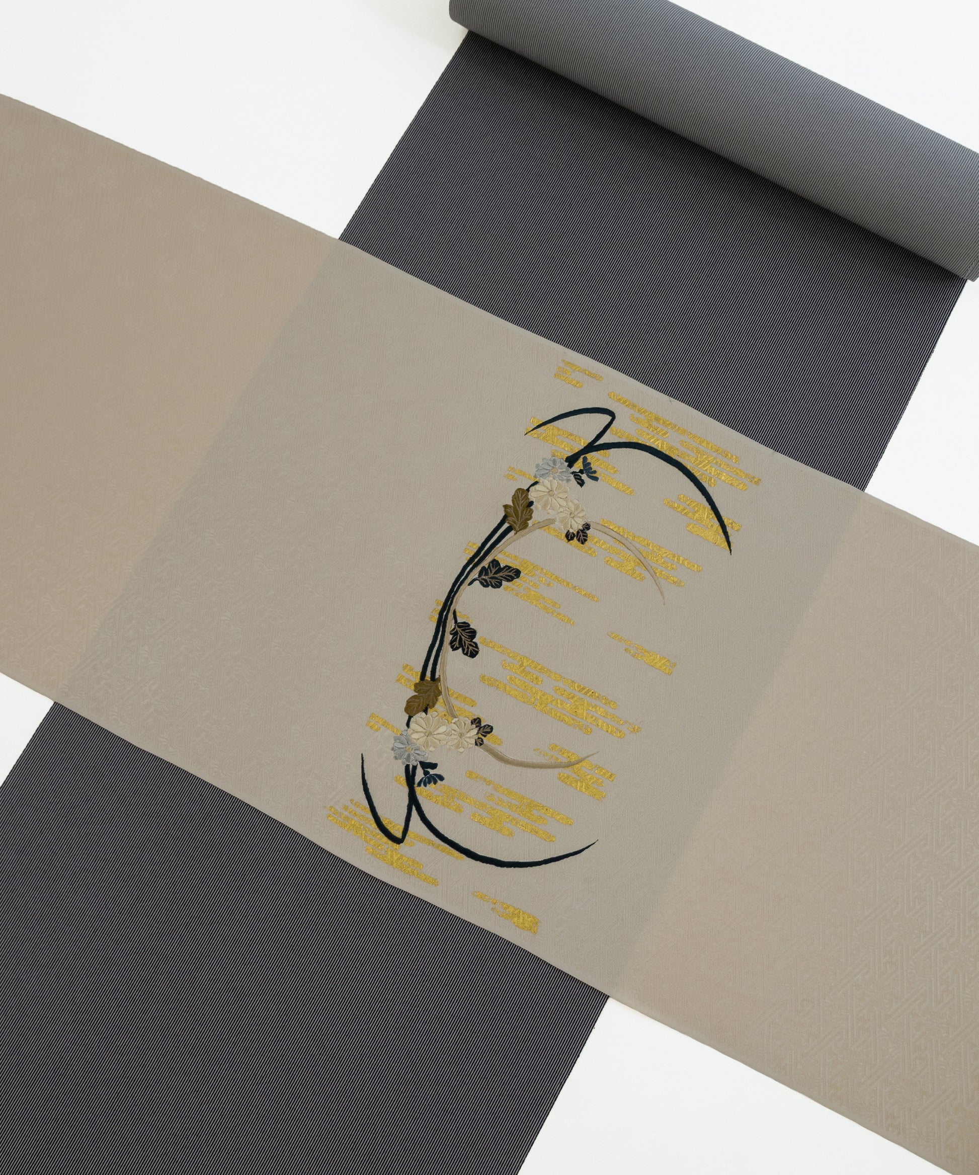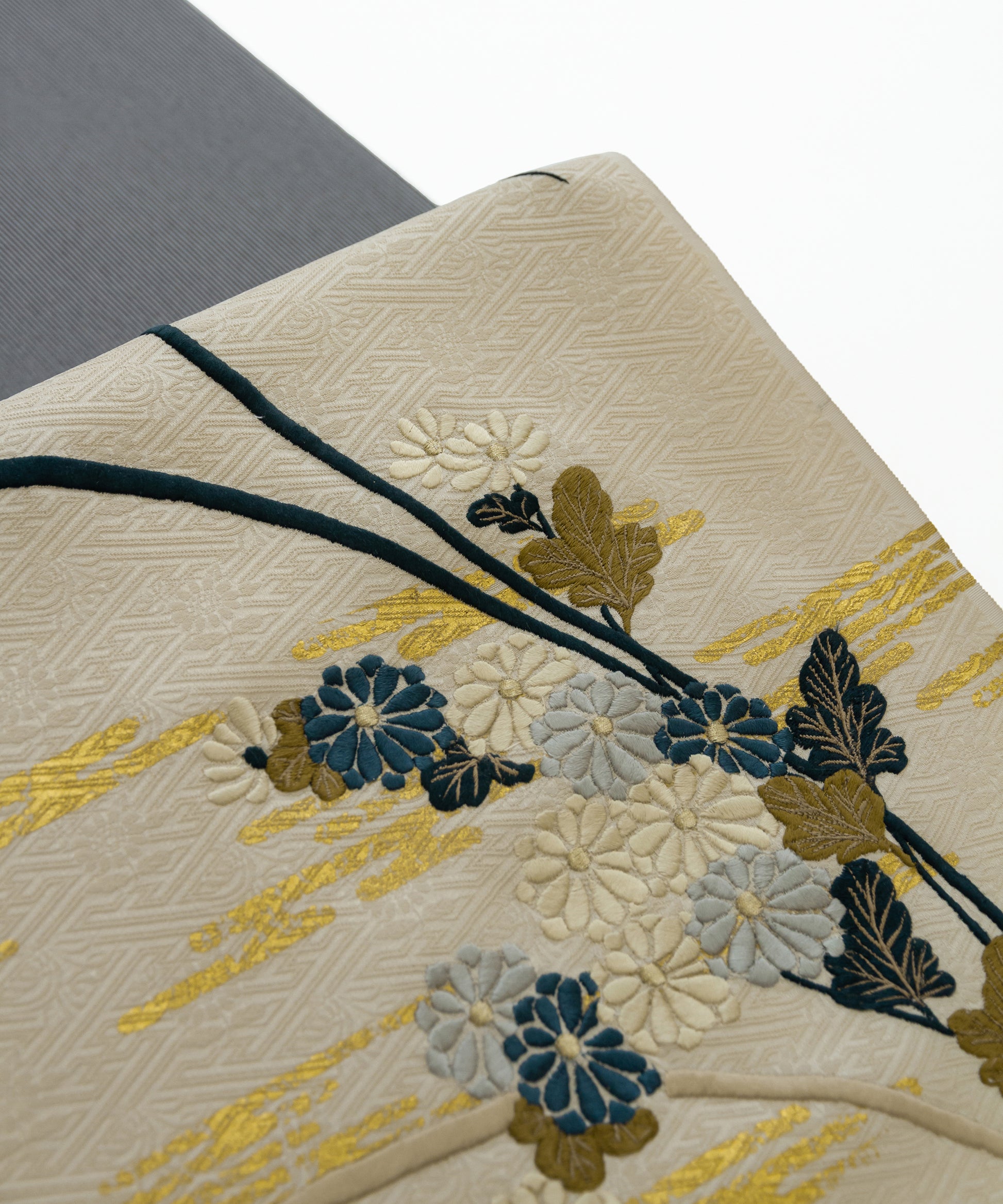 こちらの作品は白茶色に染められた紗綾形が地紋となり、金彩と刺繍で菊と芒が繊細に描かれております。江戸時代初期に流行した、刺繍や箔などを組み合わせて、当時の職人が技術を競い合い、より美しい情景を表現しつづけてきた日本の伝統的な柄です。
