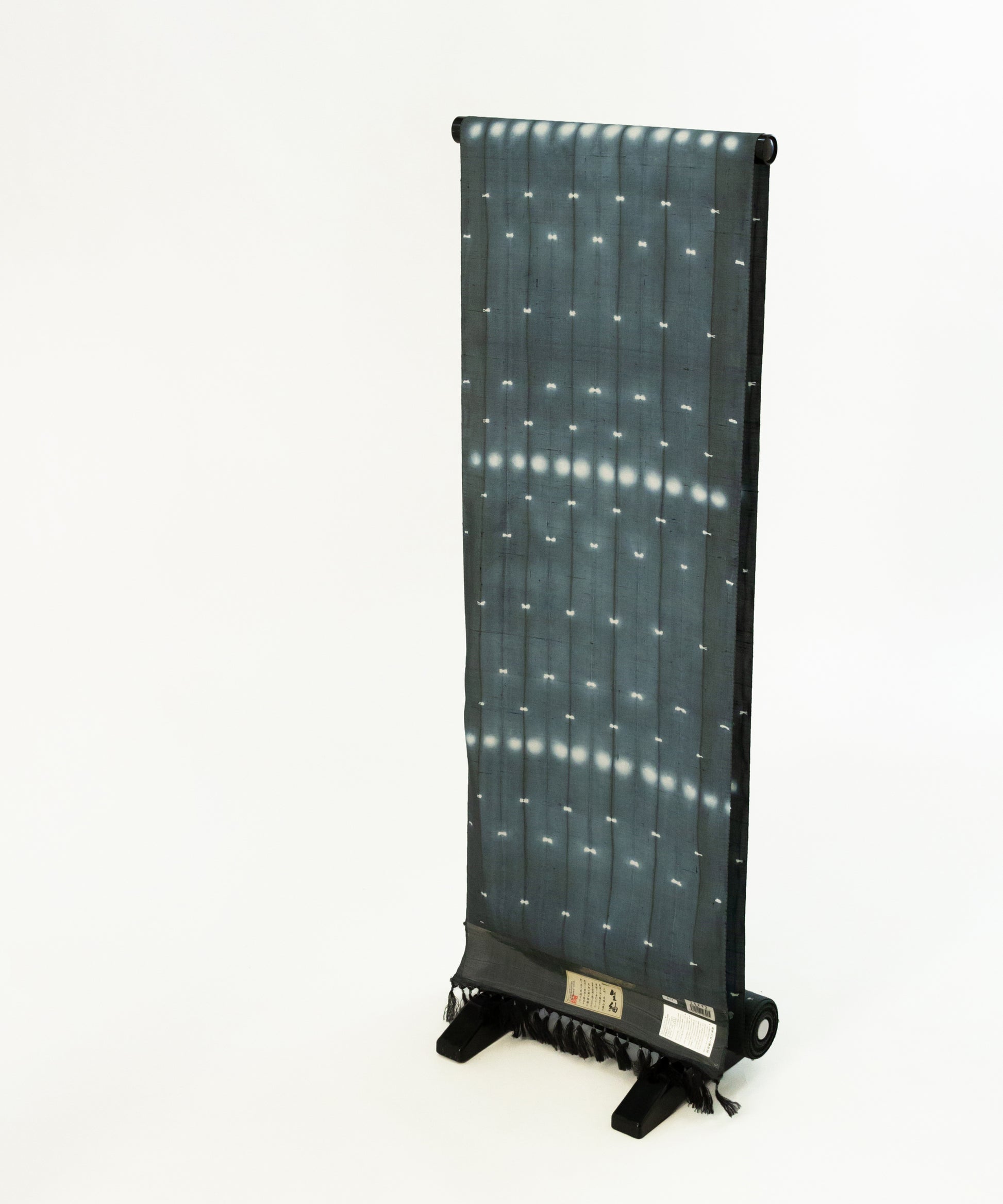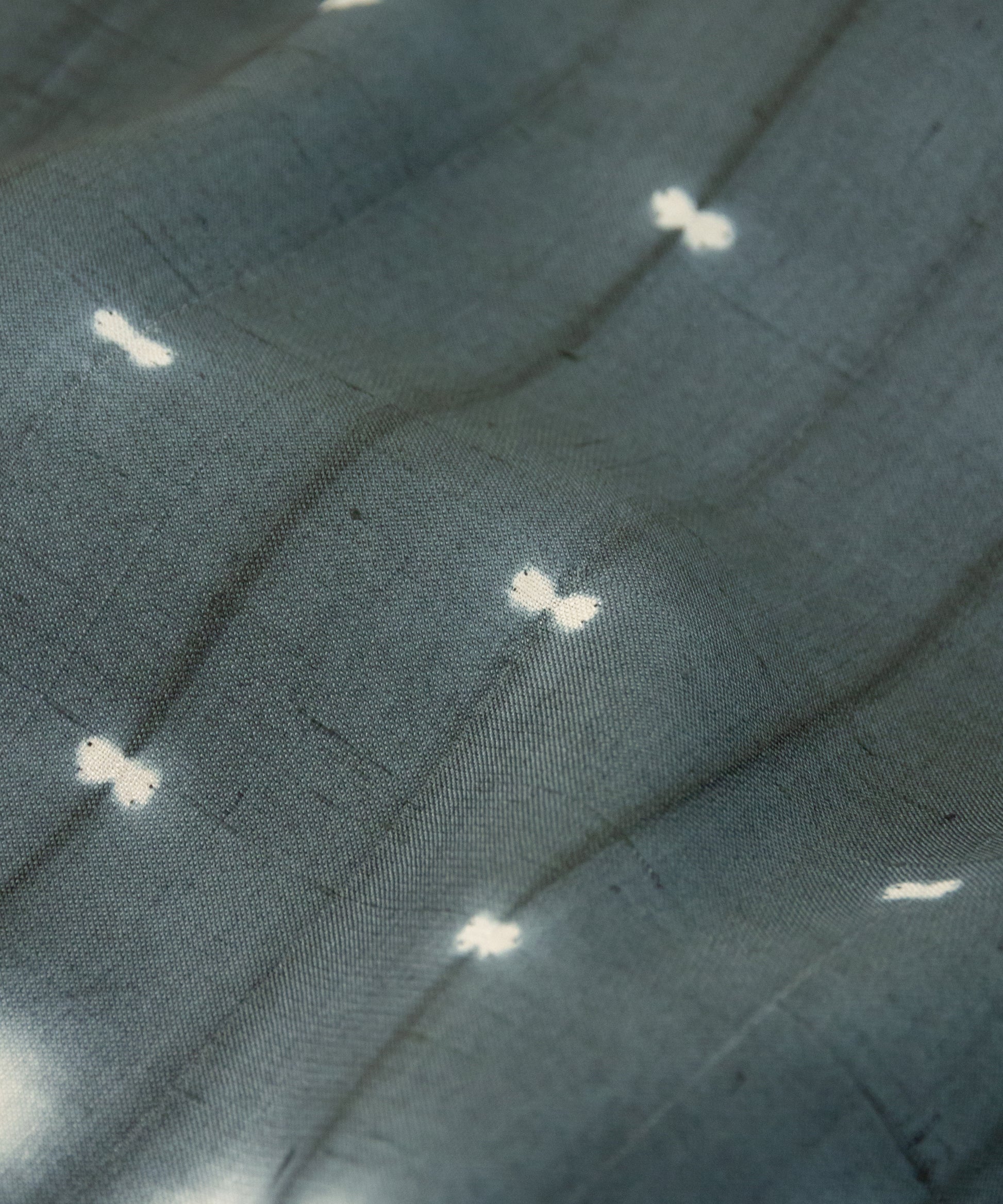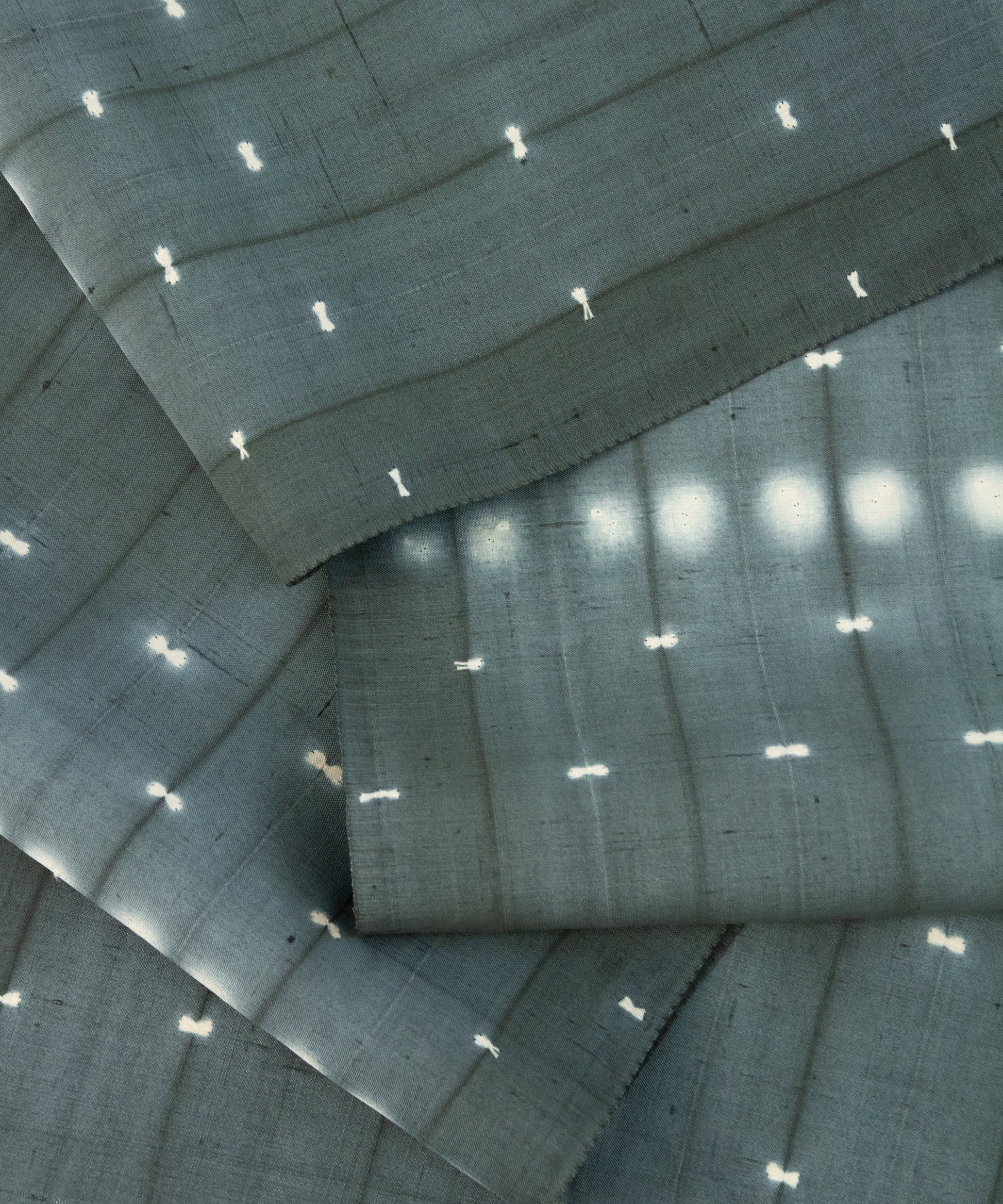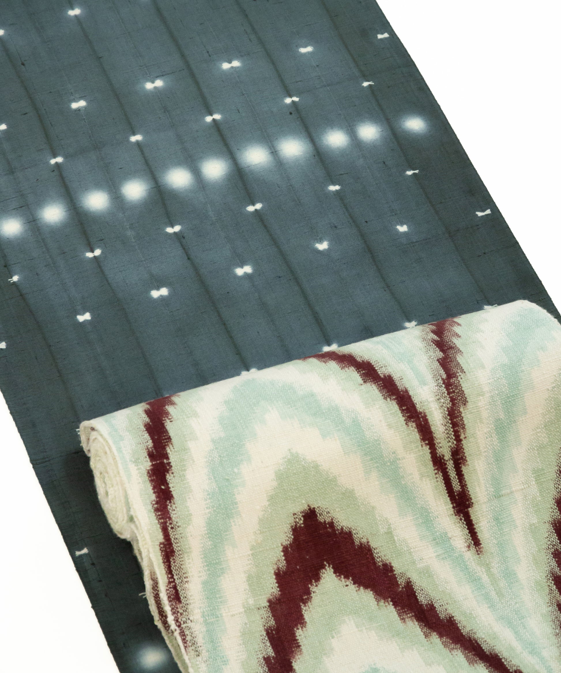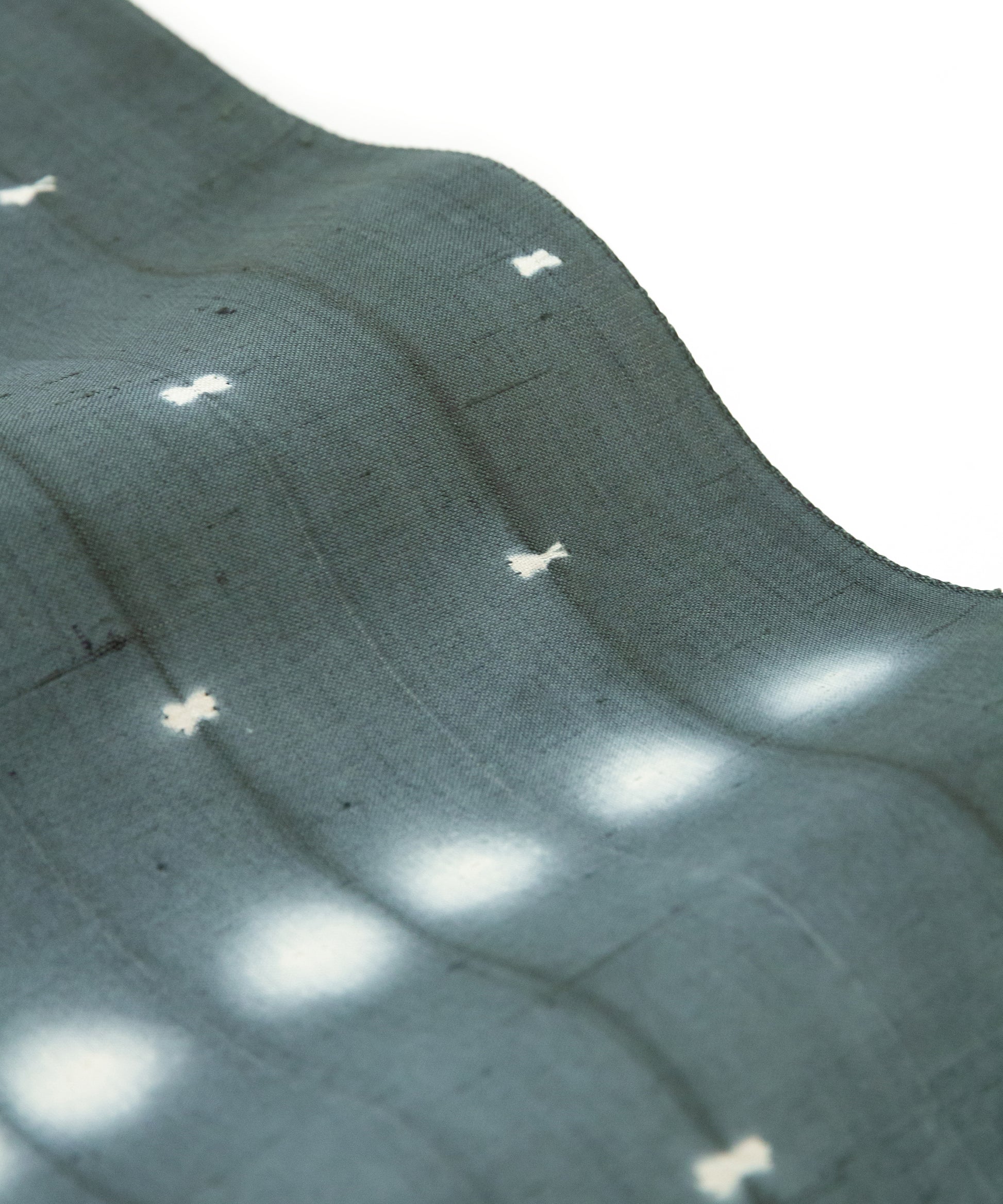 生地を屏風状に折り畳み、折り目を縫い締め、その上下からボタンではさみ縫い固める。そして染めるという工程の中で表現された二種類の絞り紋様です。