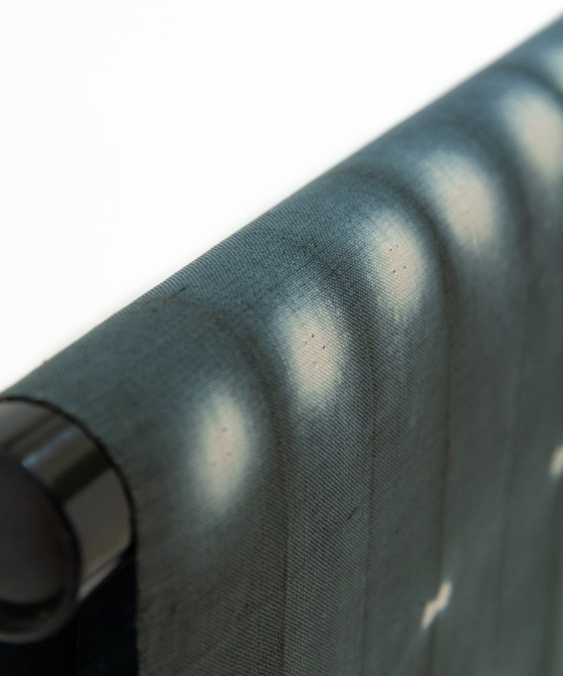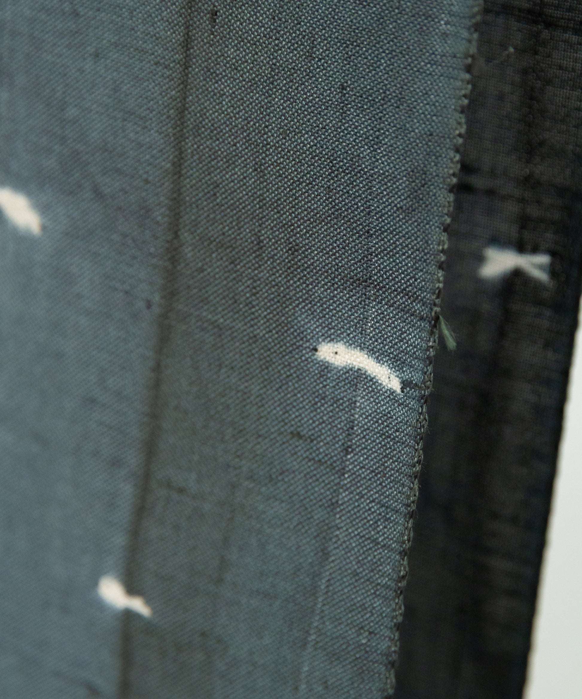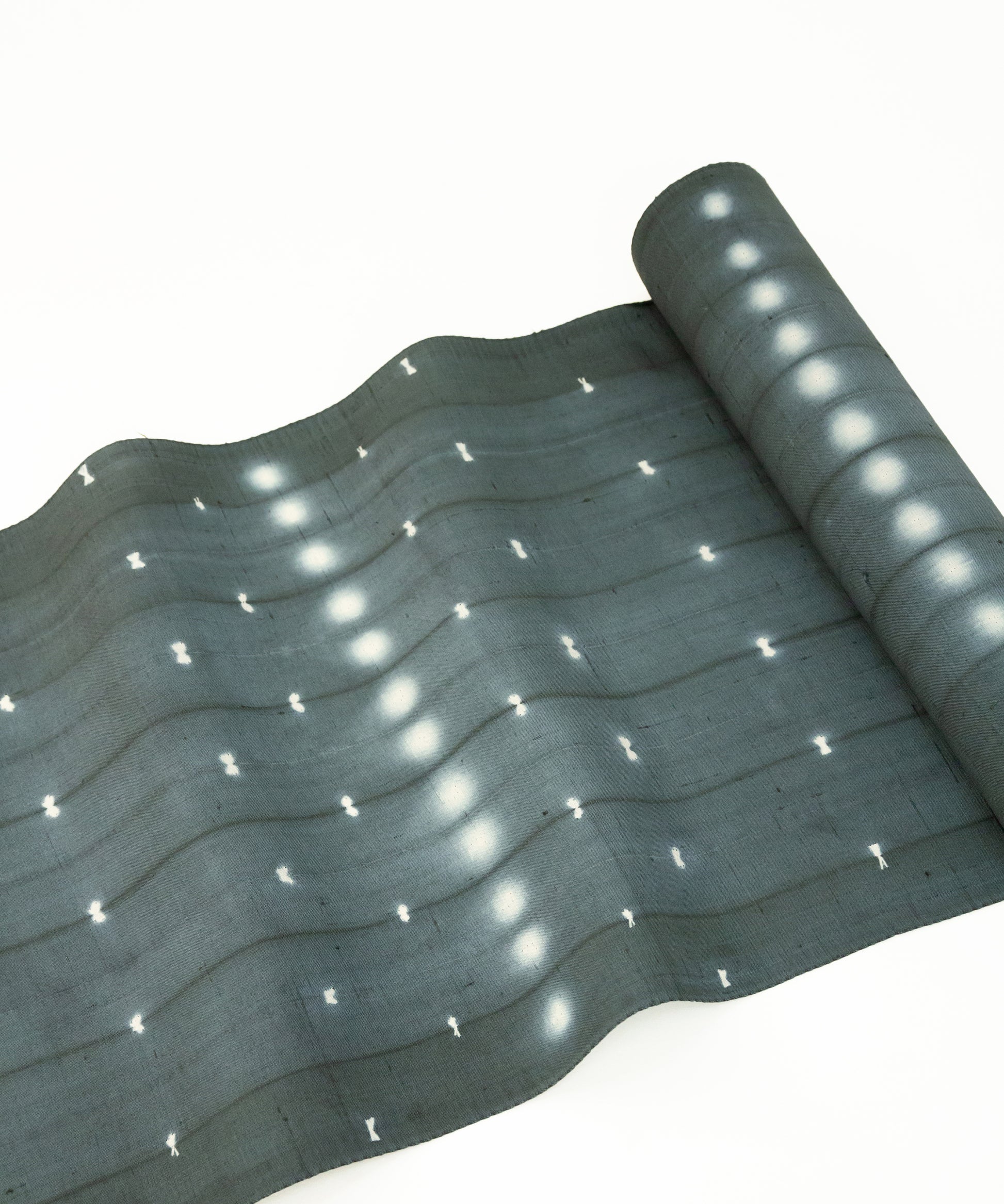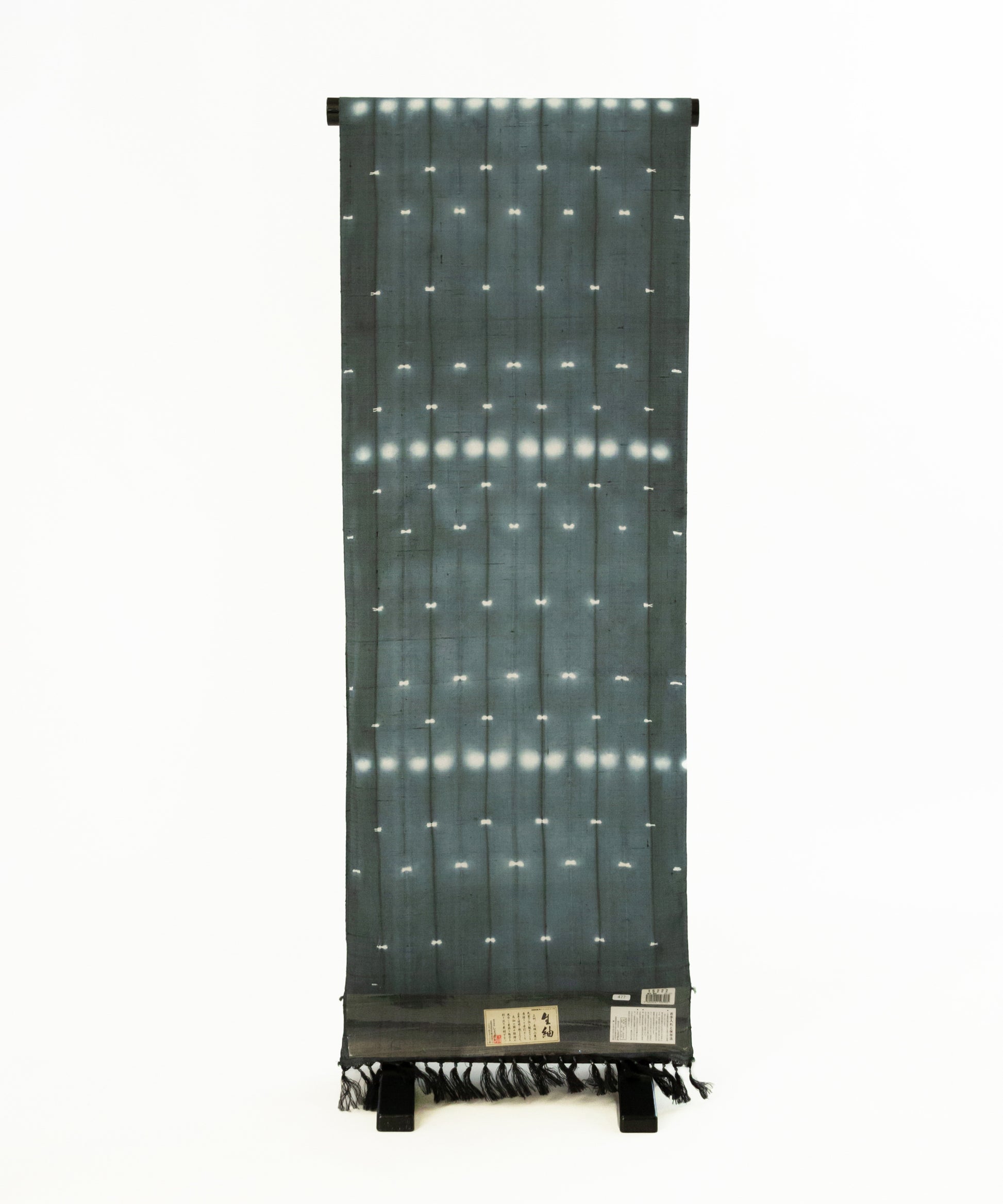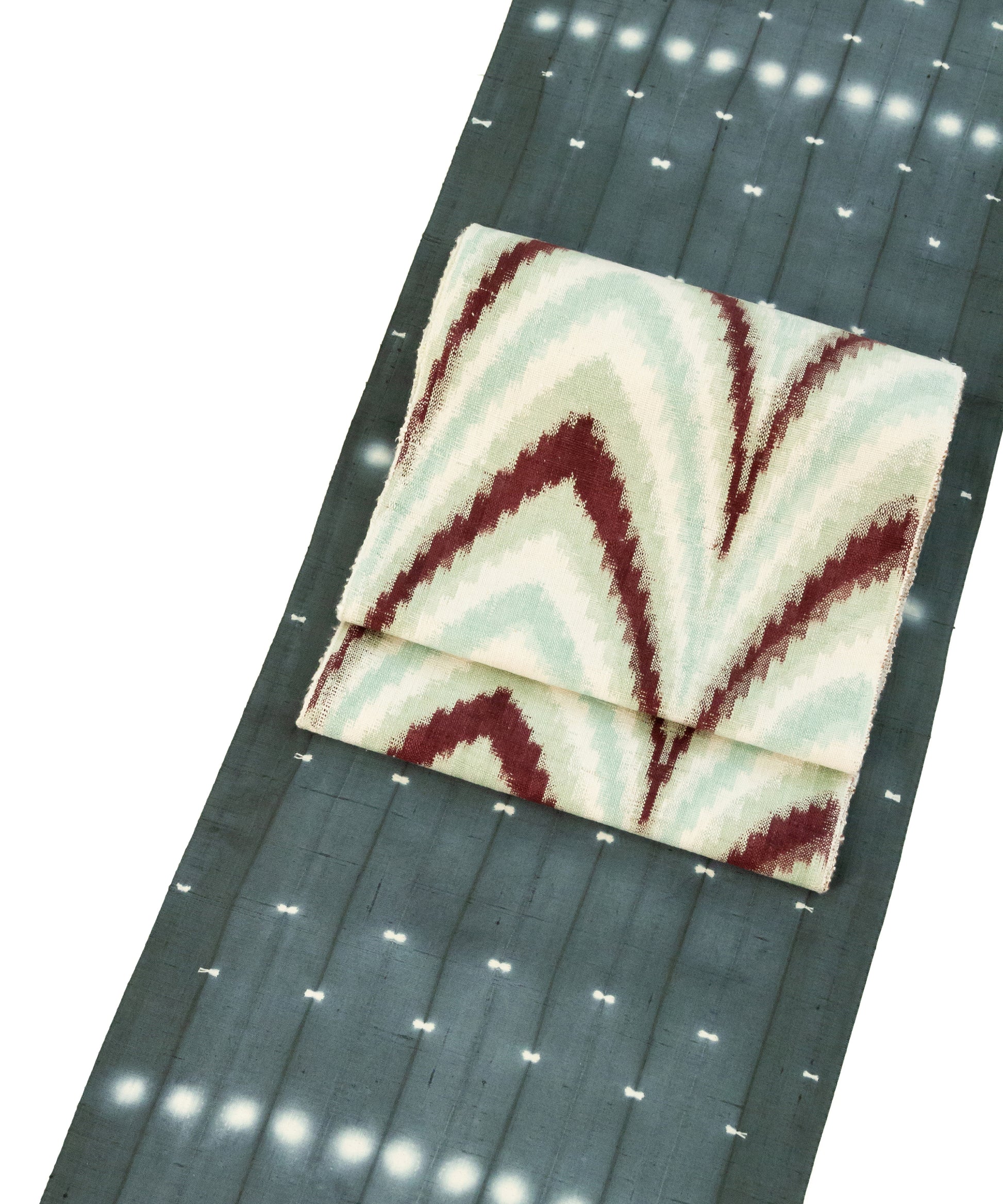 生地を屏風状に折り畳み、折り目を縫い締め、その上下からボタンではさみ縫い固める。そして染めるという工程の中で表現された二種類の絞り紋様です。