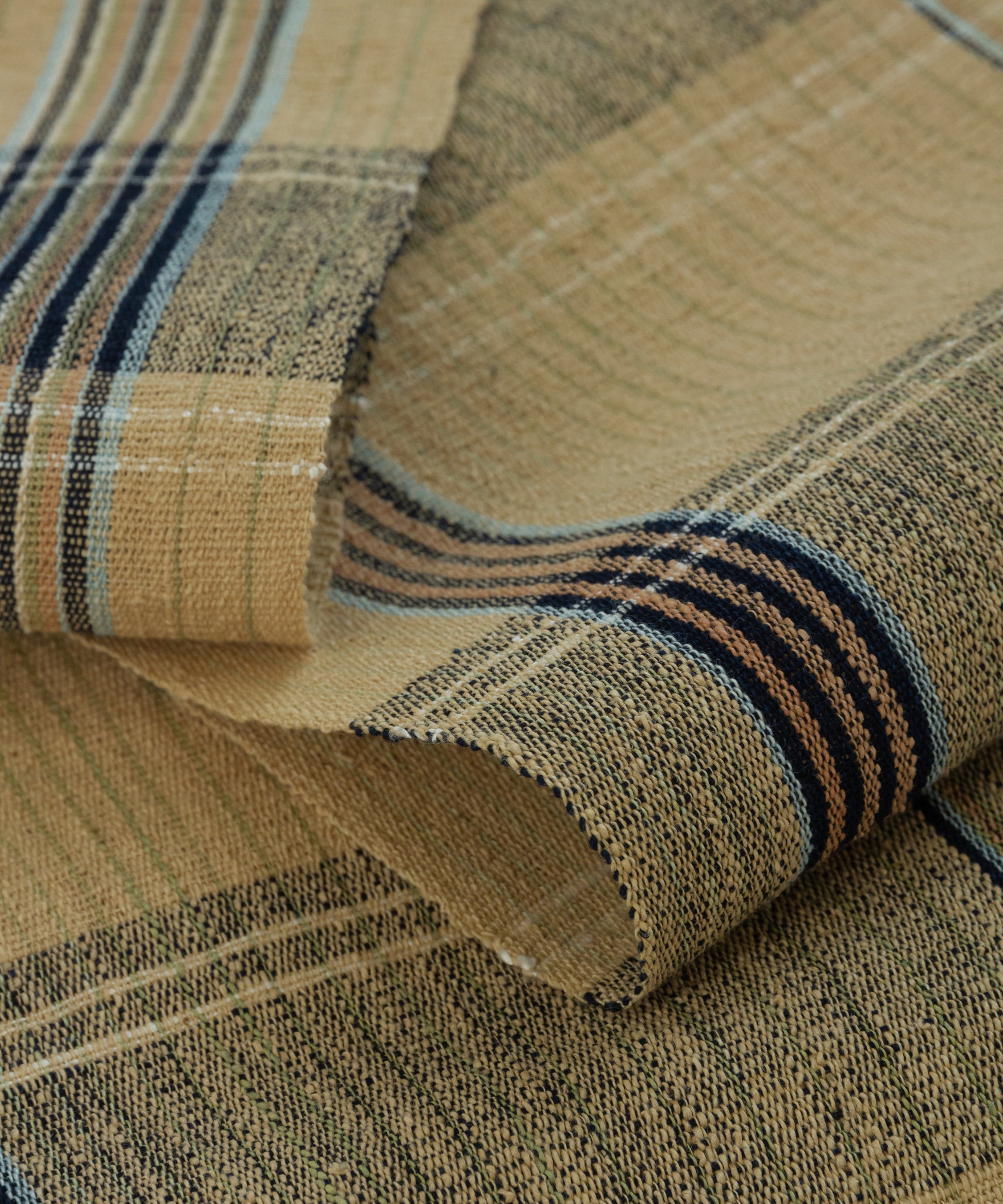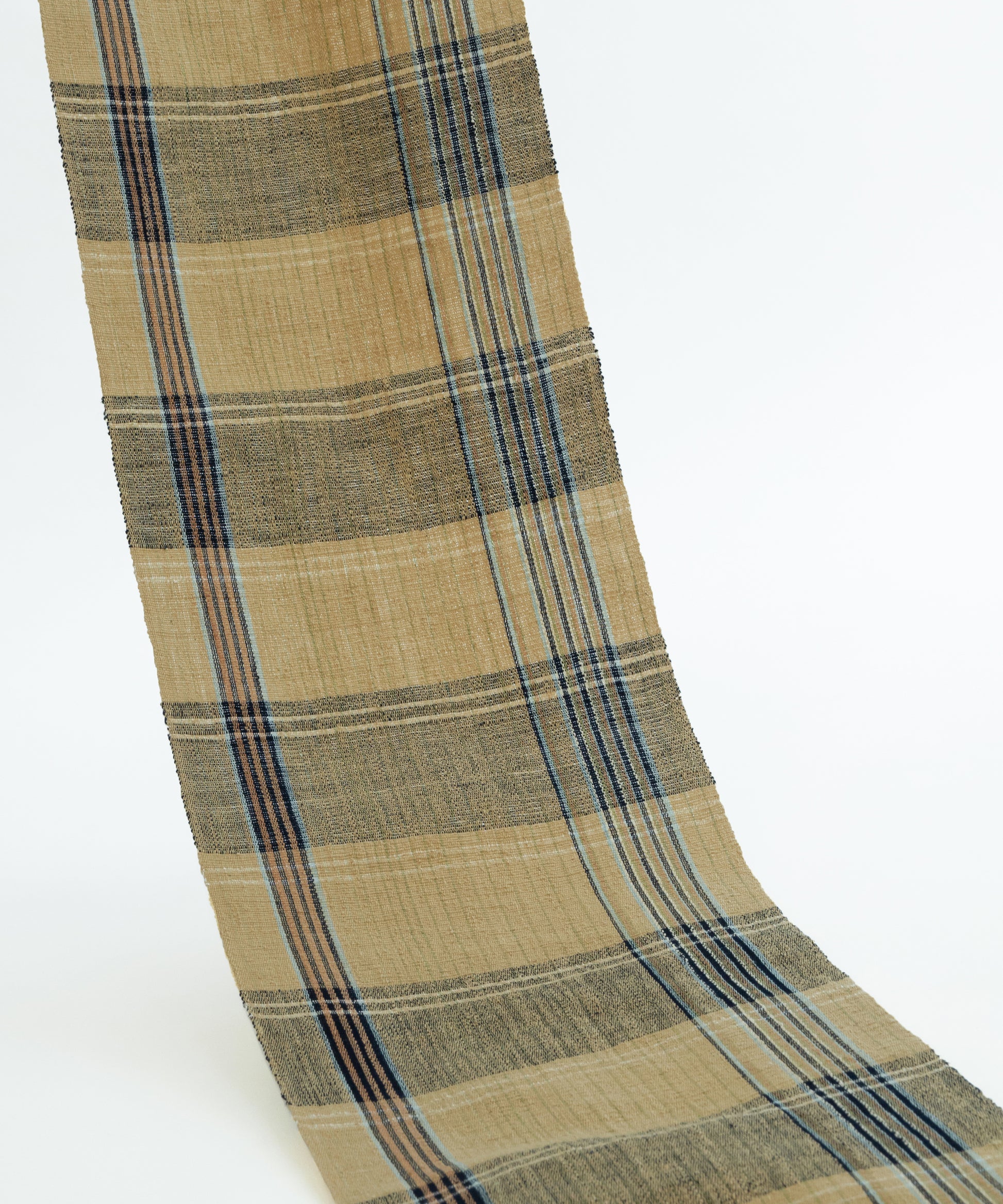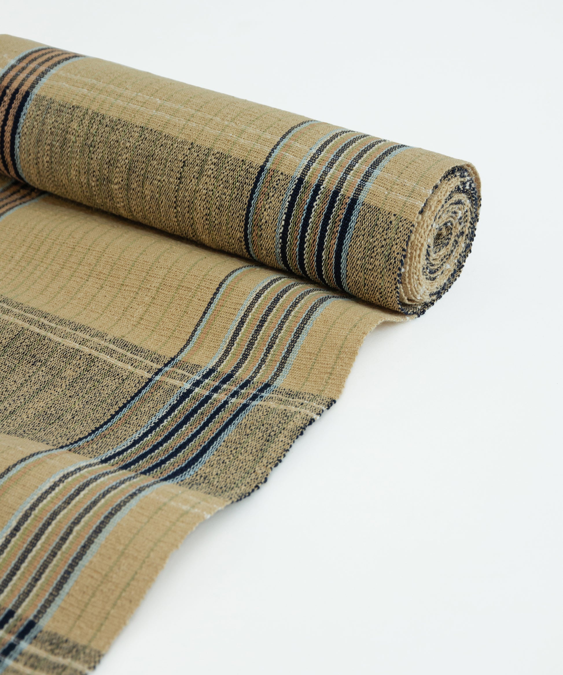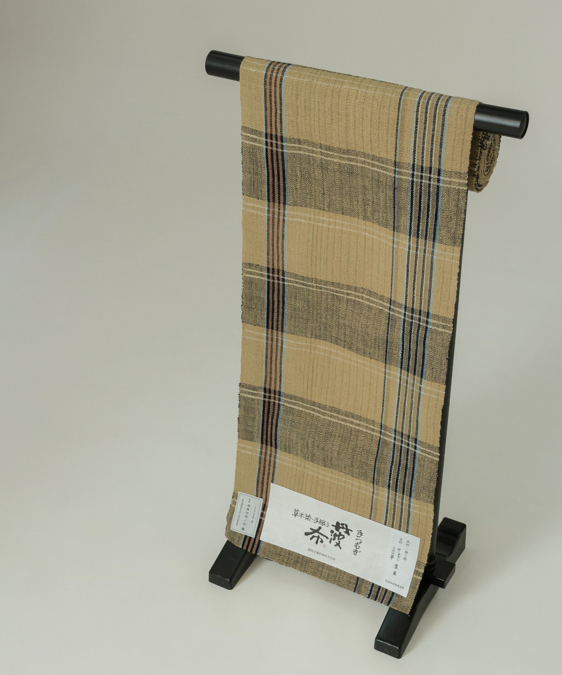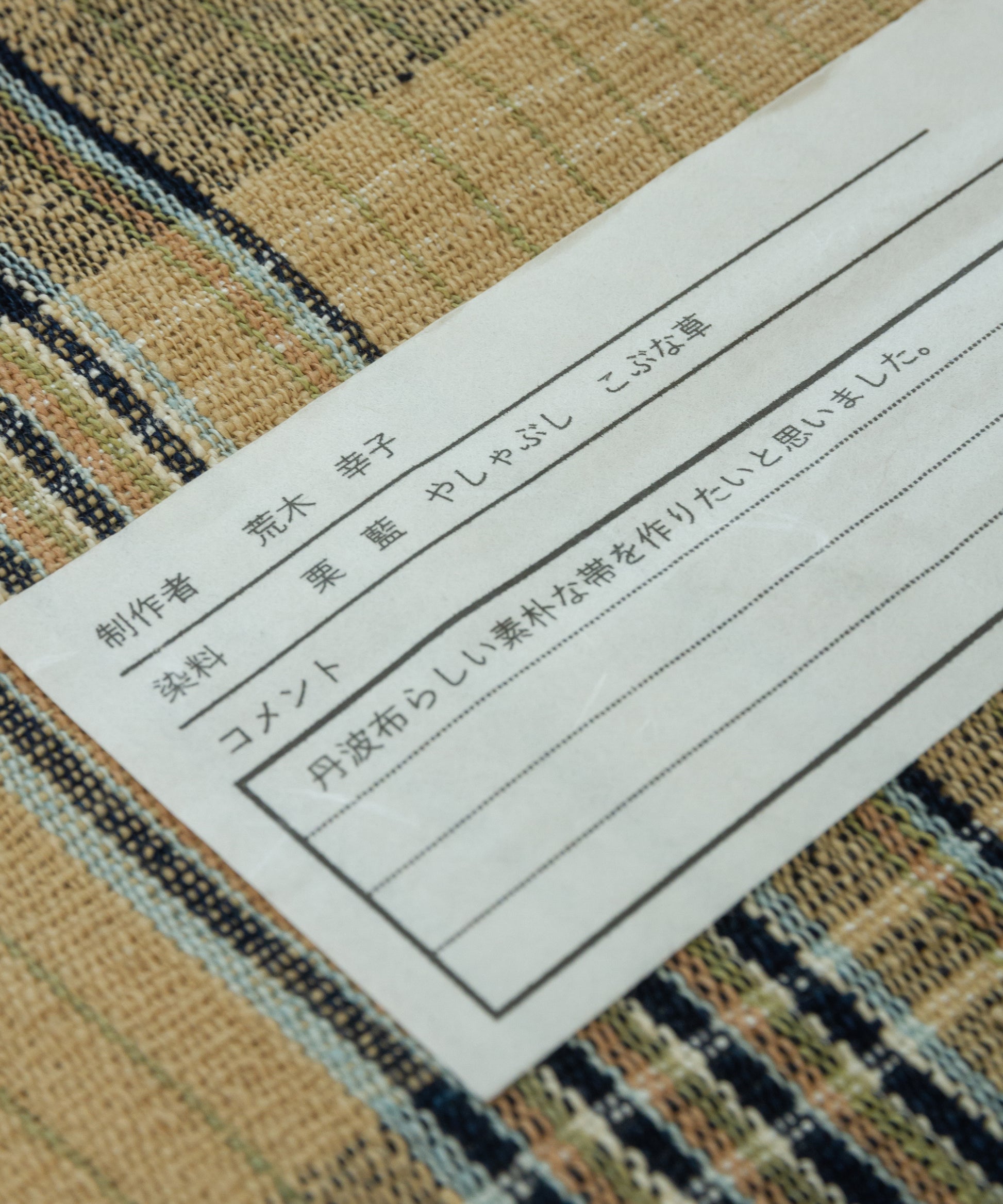 織手は女性が主で、家事育児や仕事の合間に織り上げるのも昔ながらのスタイルです。使われる染料は、栗の皮、こぶな草、やしゃぶしなどの身近な植物や藍を使い、優しさやあたたかみのある縞や格子柄が特徴です。気負わずに、カジュアルで優しいデザインと締め心地ですので、リラックスして街着のお出掛けを楽しめるところが丹波布の魅力でございます。