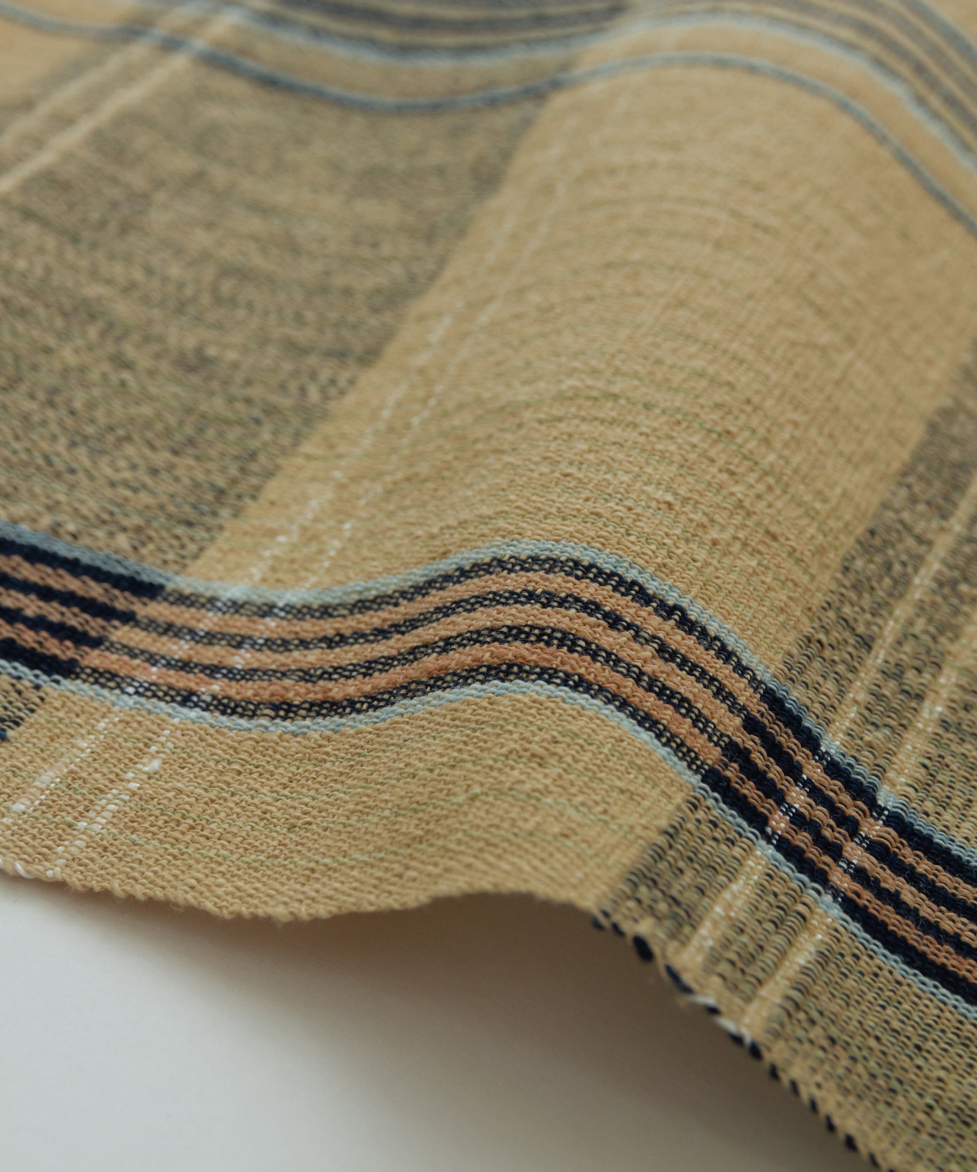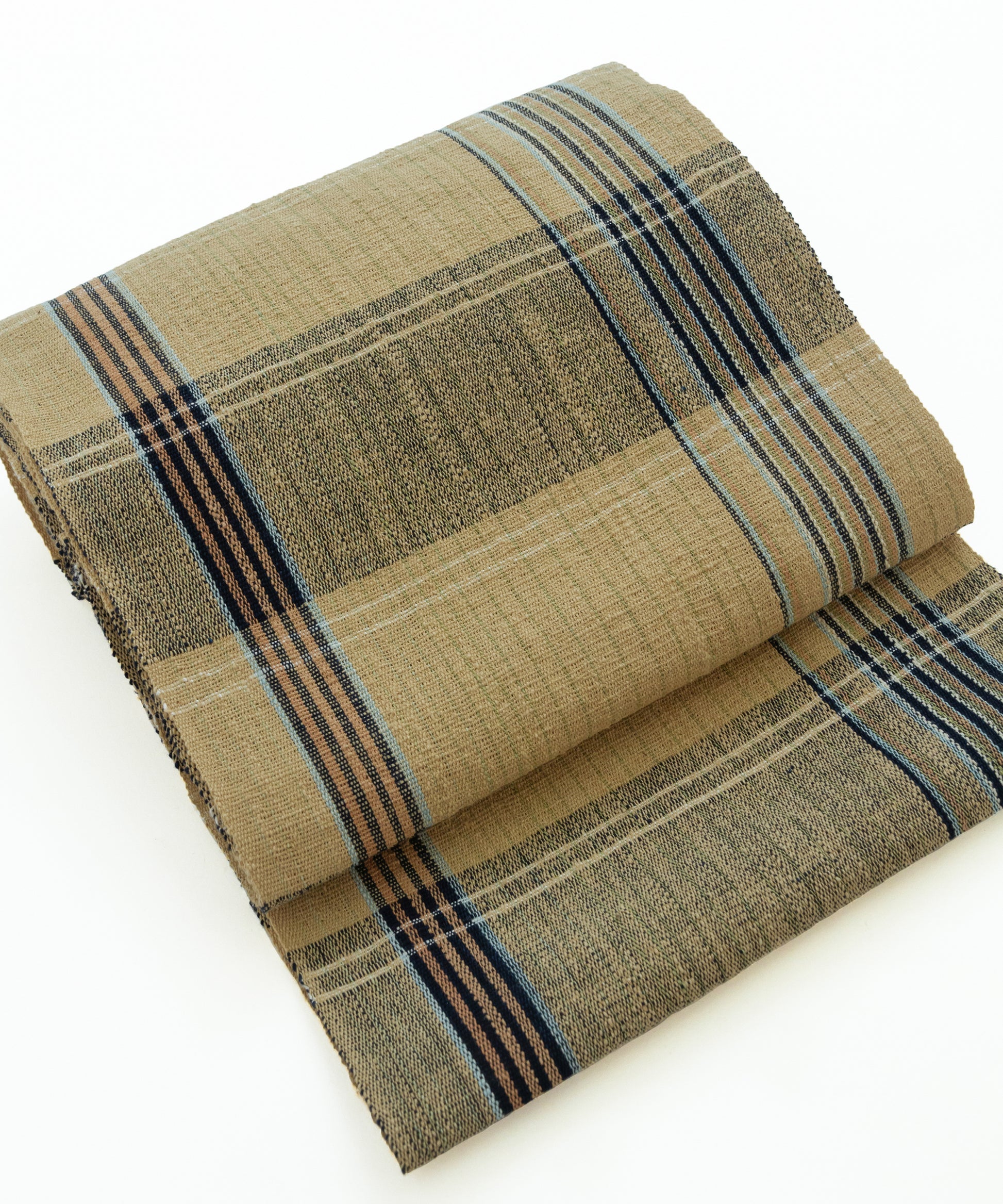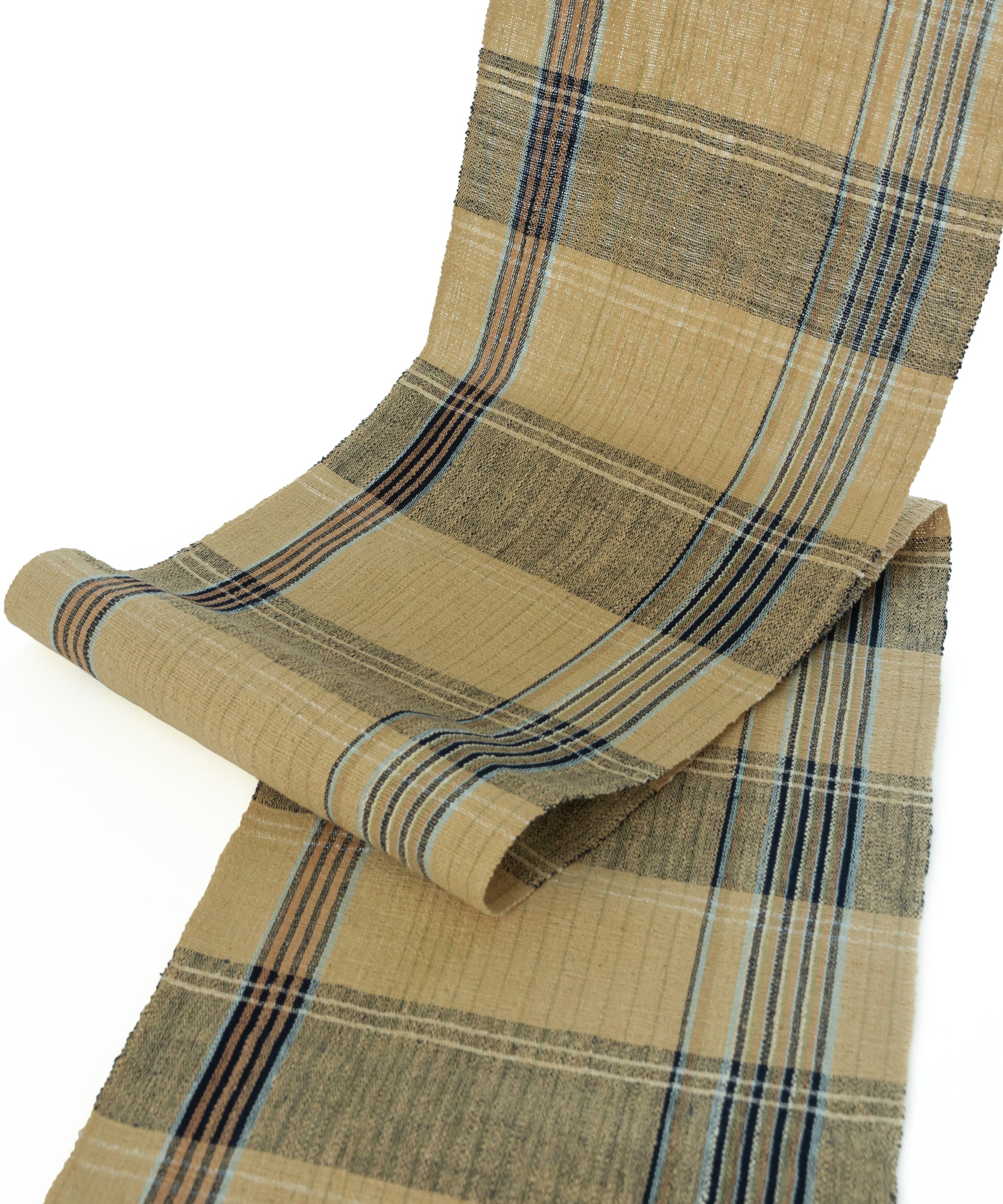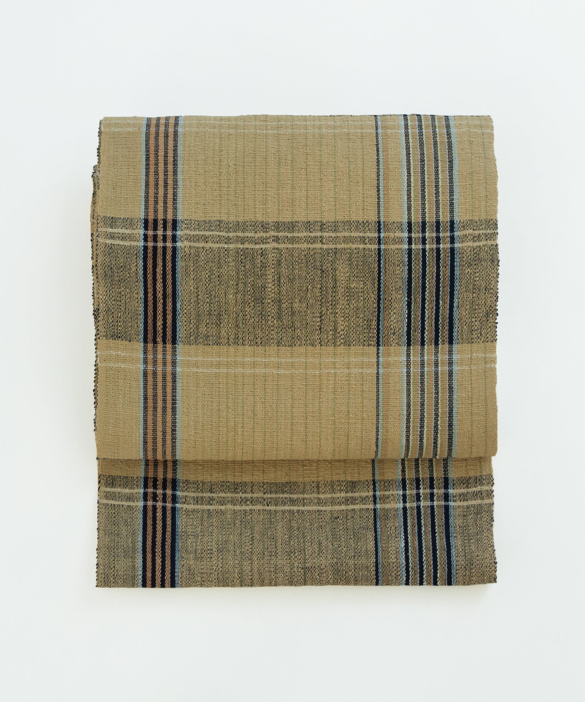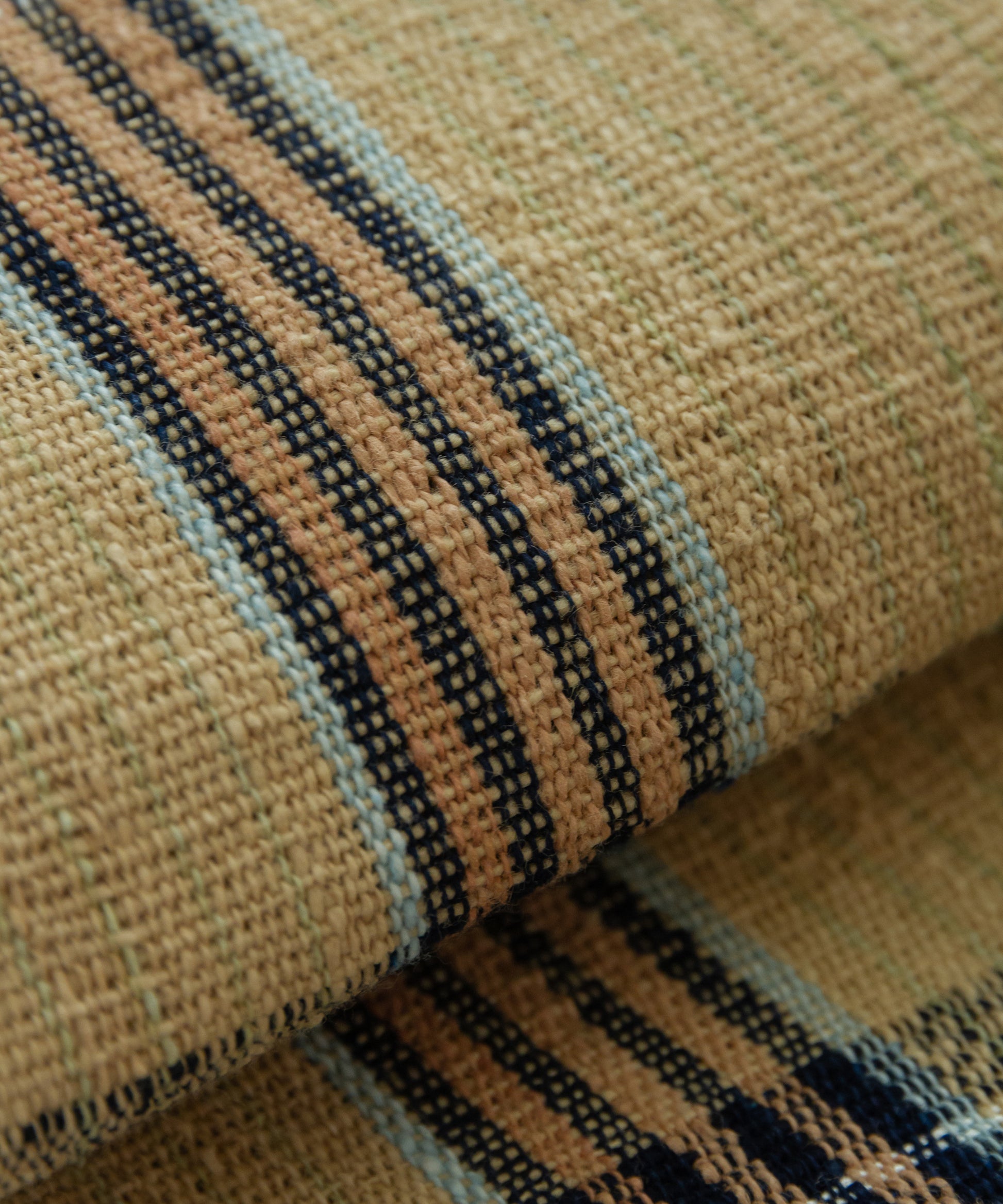 織手は女性が主で、家事育児や仕事の合間に織り上げるのも昔ながらのスタイルです。使われる染料は、栗の皮、こぶな草、やしゃぶしなどの身近な植物や藍を使い、優しさやあたたかみのある縞や格子柄が特徴です。気負わずに、カジュアルで優しいデザインと締め心地ですので、リラックスして街着のお出掛けを楽しめるところが丹波布の魅力でございます。