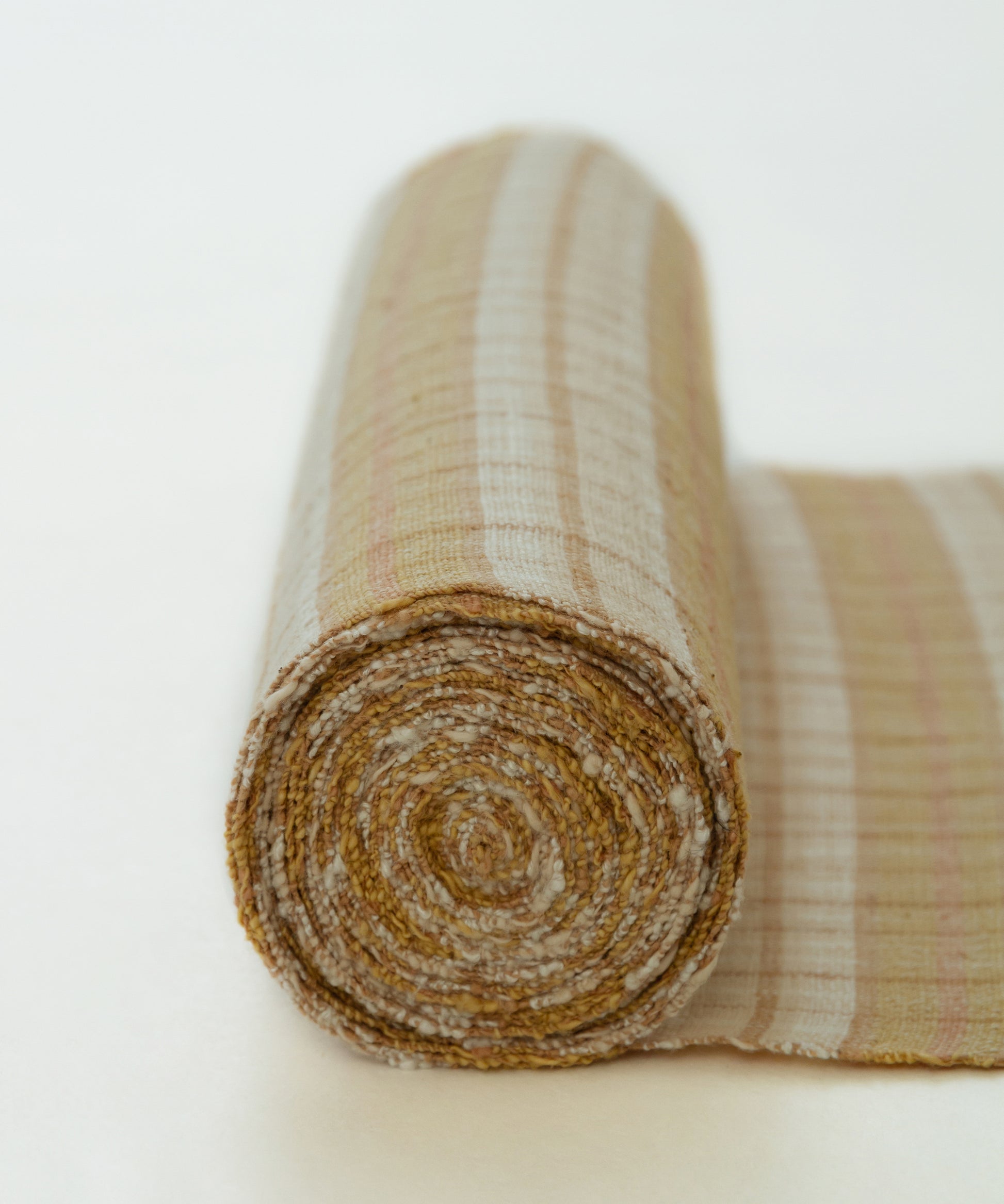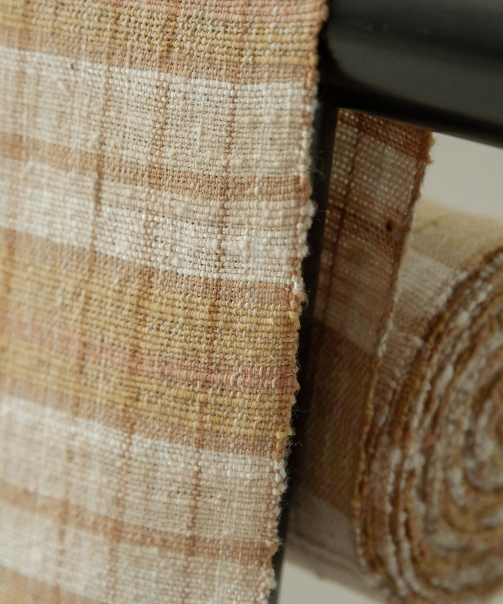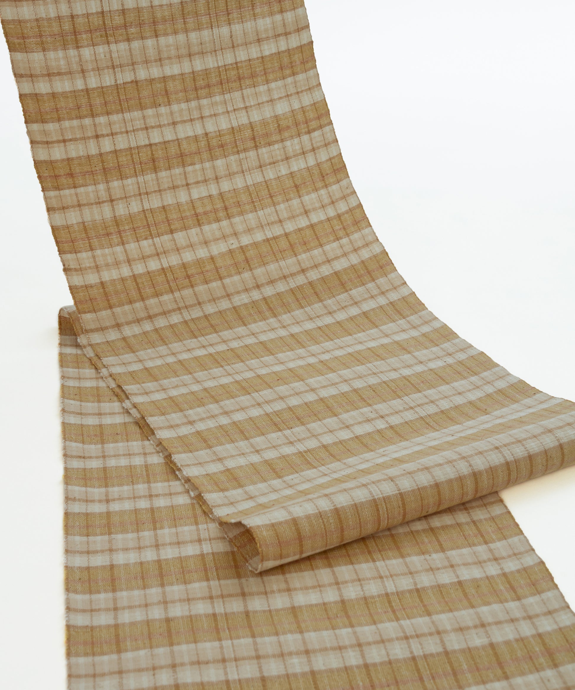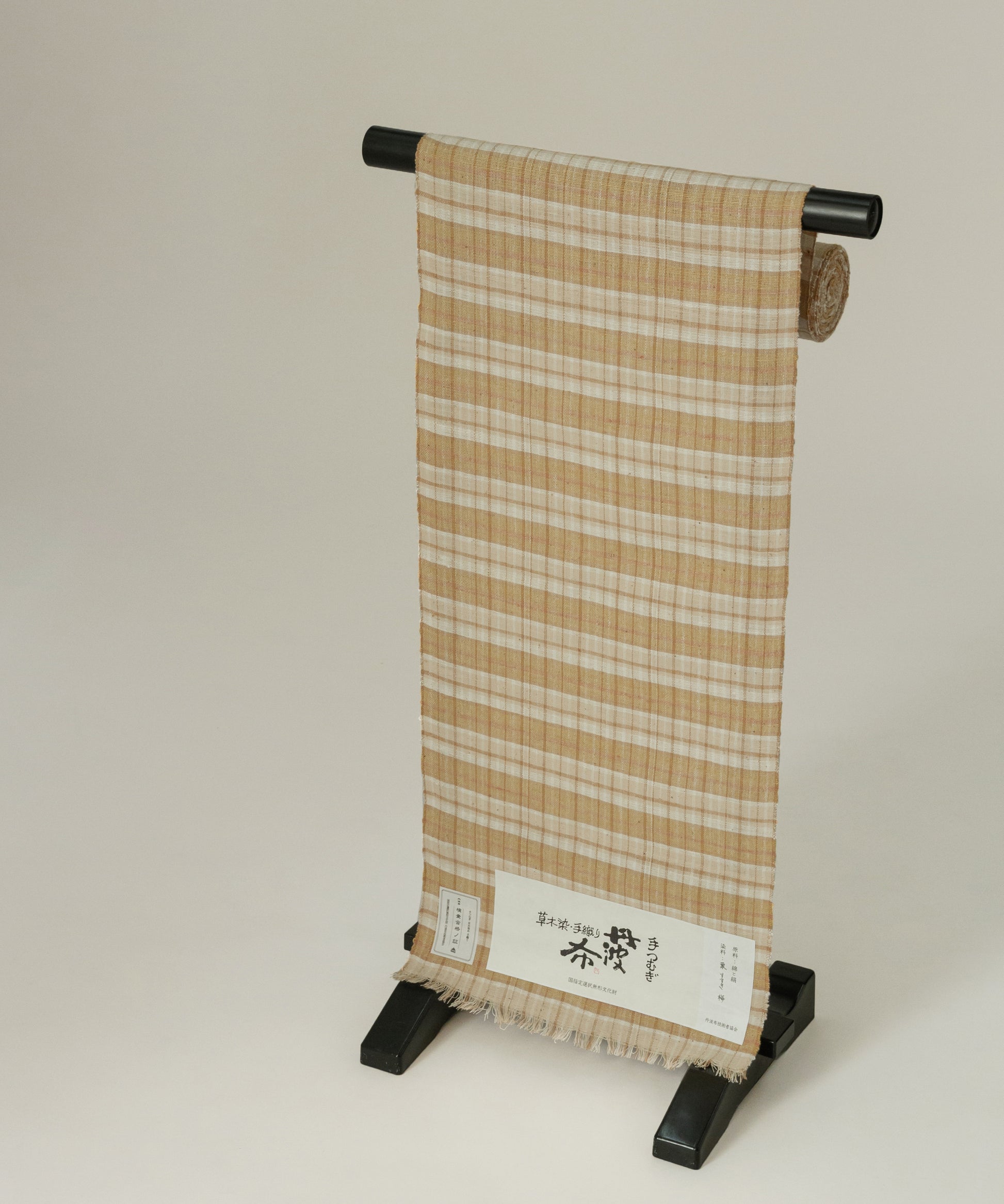 丹波布は昔ながらの技法で手紡ぎ、草木染め、手織りとすべての工程を一人の手作業で作られ、絹のつまみ糸を緯糸に入れます。このつまみ糸により、しなやかさと柄の表情にもつややかさが生まれます。